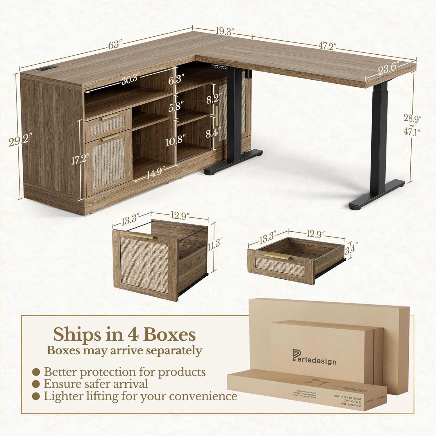 Height Adjustable Electric Standing Desk, 48 x 24 Inches Sit Stand up Desk with 2 File Cabinets, AC/USB, 1.18″ Desktop, L Shaped Rattan Computer Desk for Home and Office, Natural Oak
