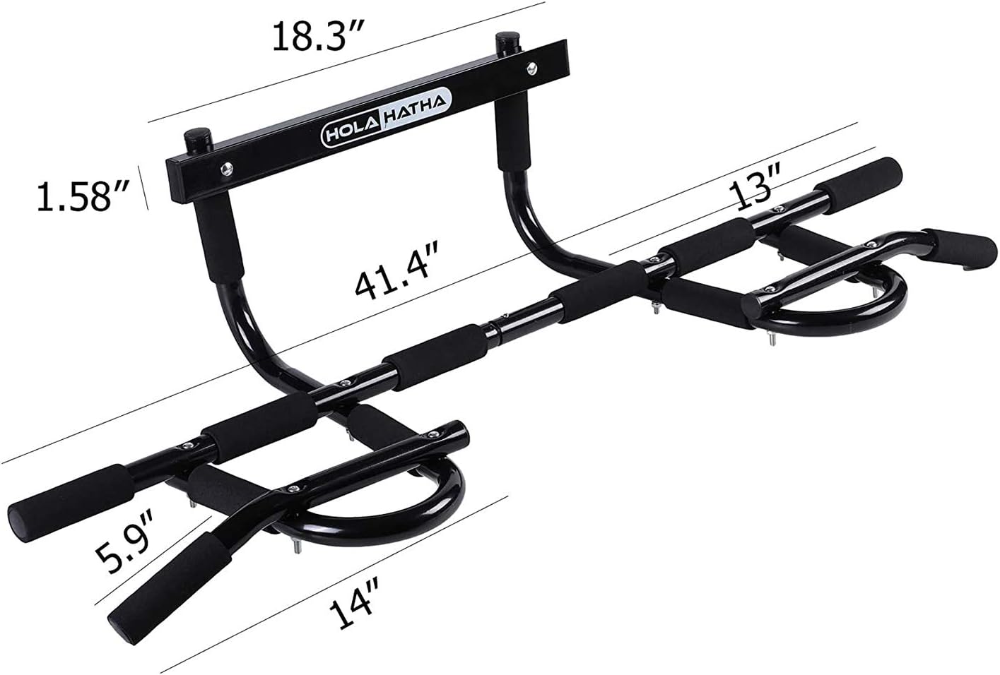 HEAVY DUTY: Our door pull up bar is sized at 41.4 inches x 14 inches x 18.3 inches. The heavy duty steel frame effortlessly keeps shape, offering maximum safety and staying firmly in place during use. The doorway pull up bar holds up to 330 lbs in weight for peace of mind.