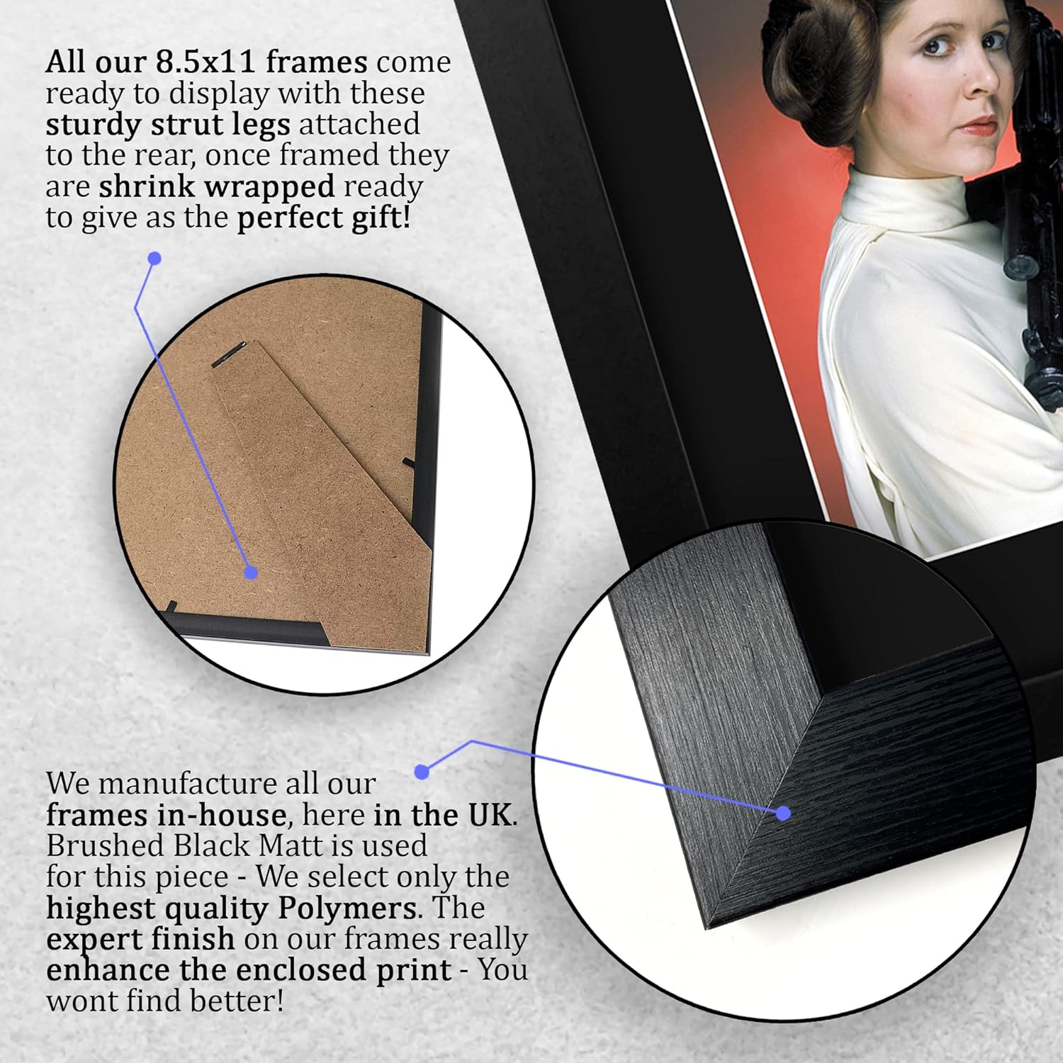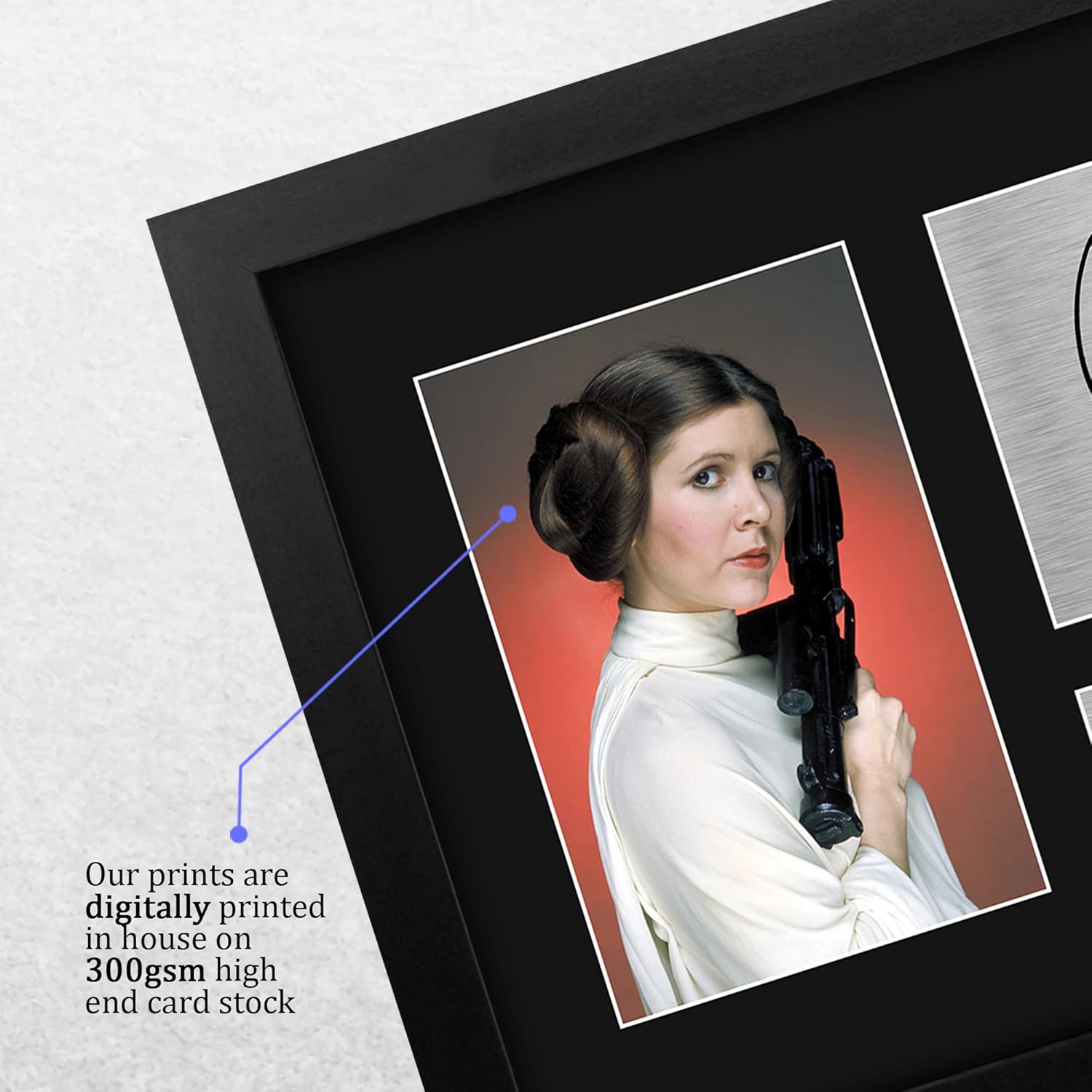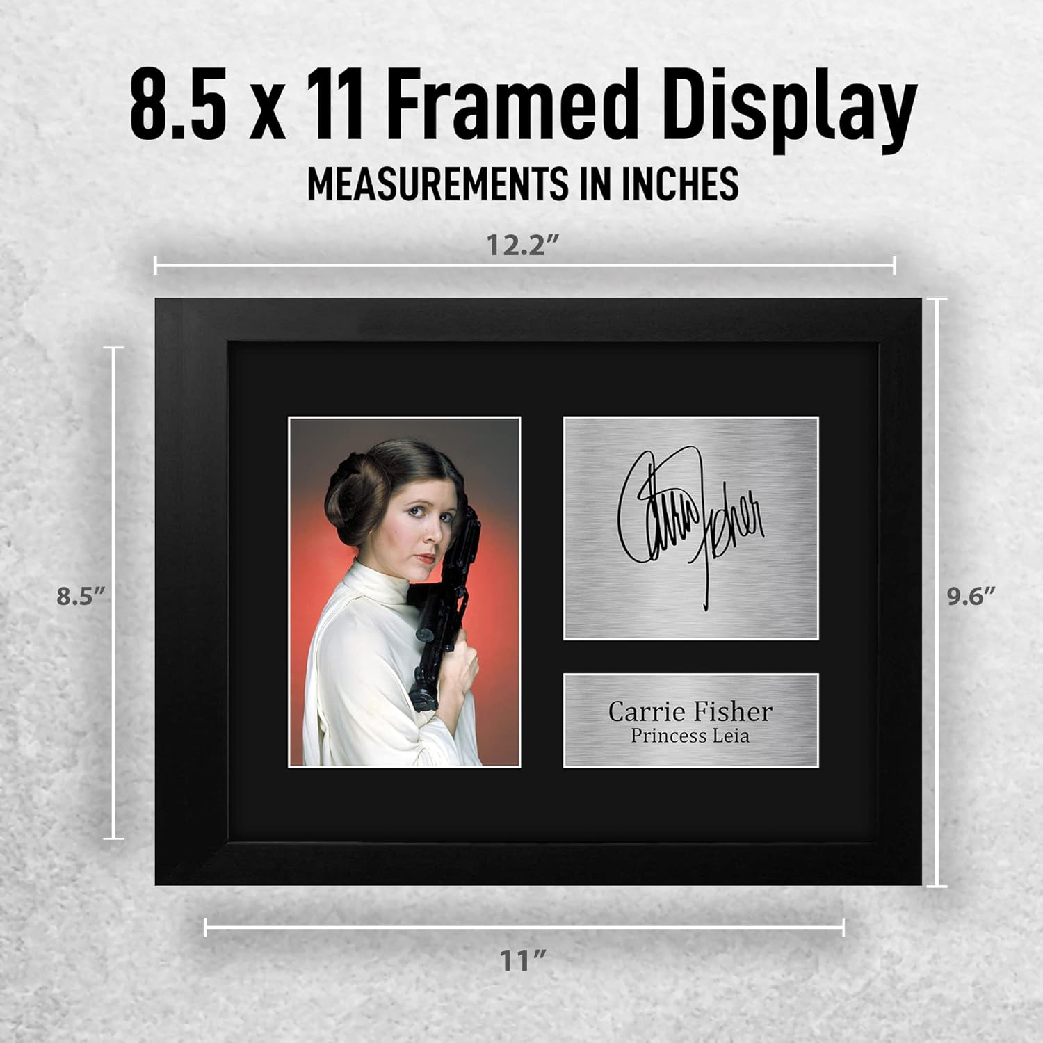 Professionally made in our studio, this US Letter Size (8.5×11 Inch) framed Carrie Fisher display makes for an ideal gift idea. This laser printed quality photograph is mounted in a precision cut three windowed acid-free matt black display board. To the left of the display there is the main image. To the right of the display there are two metallic effect plaque areas for printed copies of the name and autograph signature. This print comes framed in a sleek black polycarbonate frame that compliments the matt mount display. Lightweight, but of the highest quality, these make the ideal Christmas/Birthday gift for fans of all ages, and best of all, they definitely won’t break the bank!