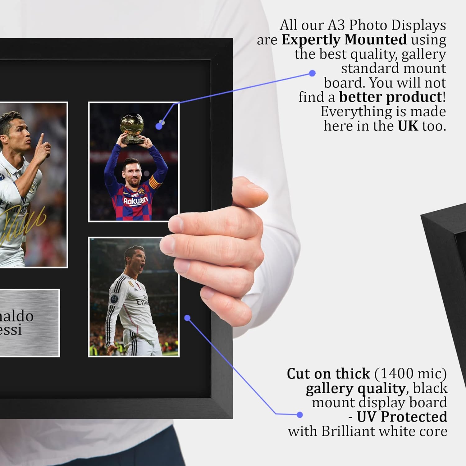 Professionally made in our studio, this 16 x 12 inch (A3) framed Cristiano Ronaldo & Lionel Messi display makes for an ideal gift idea. This laser printed quality photograph is mounted in a precision cut six windowed acid-free matt black display board. To the left and right of the display there are four classic images. To the centre of the display a main focal image taking pride of place with printed signature overlay. Below this is a metallic effect plaque area with the name and career information. This item comes framed in a sleek black polycarbonate frame that compliments the matt mount display and a clear perspex front to keep it dust free and clean. Lightweight, but of the highest quality, these make the ideal Christmas/Birthday gift for fans of all ages, and best of all, it definitely won’t break the bank!