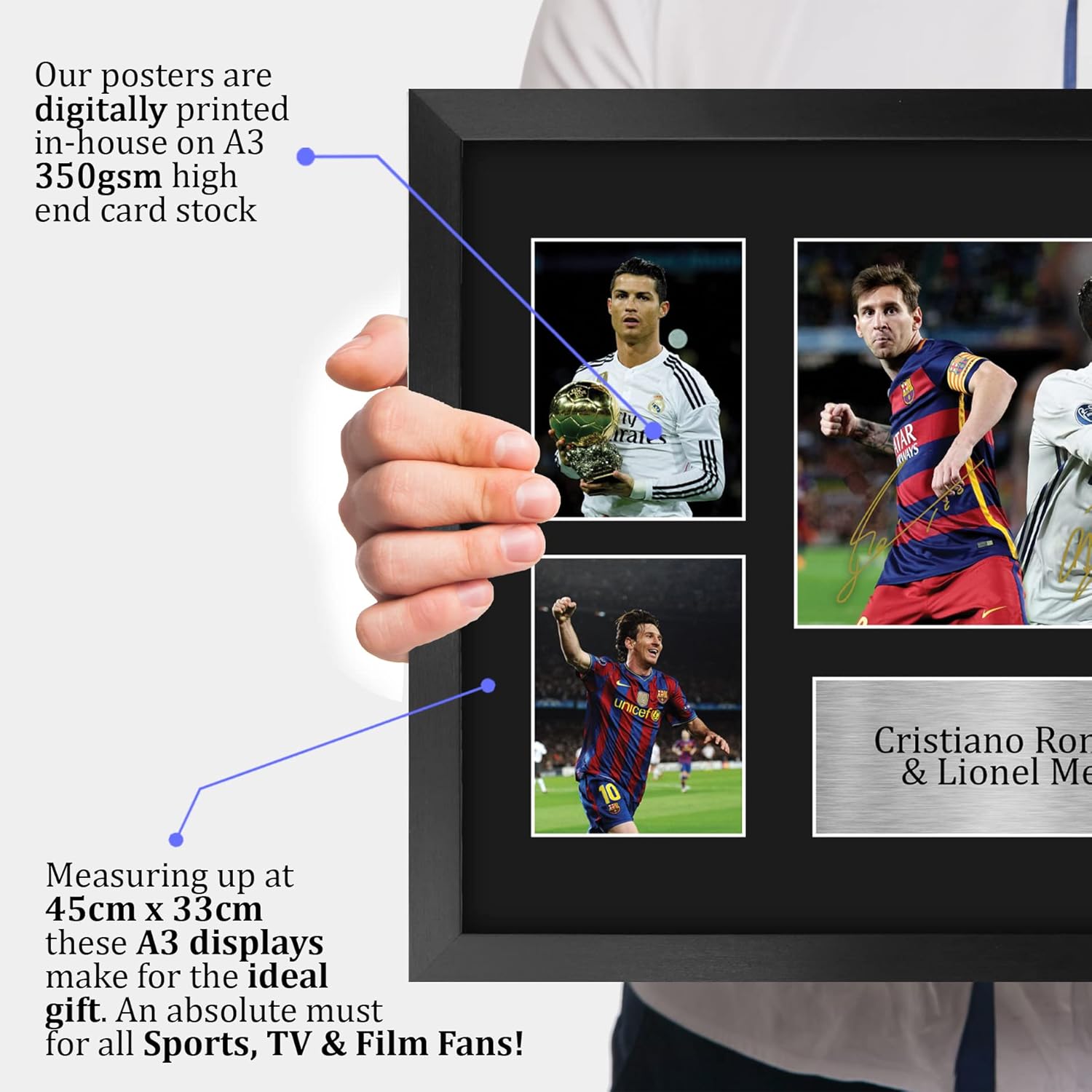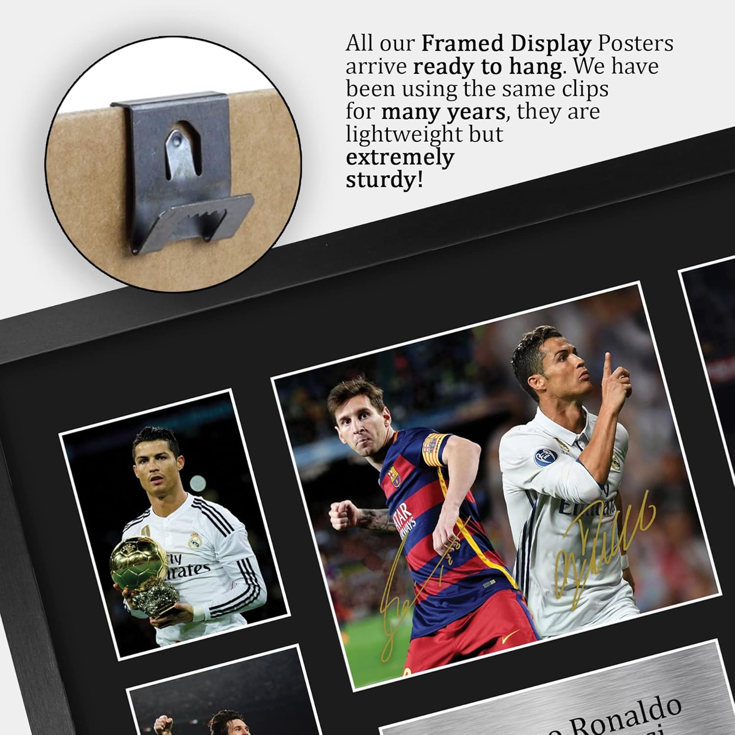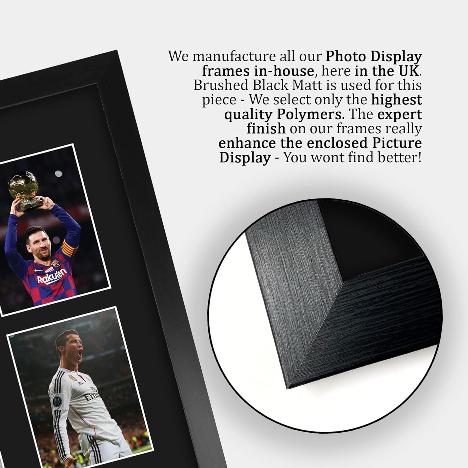 Professionally made in our studio, this 16 x 12 inch (A3) framed Cristiano Ronaldo & Lionel Messi display makes for an ideal gift idea. This laser printed quality photograph is mounted in a precision cut six windowed acid-free matt black display board. To the left and right of the display there are four classic images. To the centre of the display a main focal image taking pride of place with printed signature overlay. Below this is a metallic effect plaque area with the name and career information. This item comes framed in a sleek black polycarbonate frame that compliments the matt mount display and a clear perspex front to keep it dust free and clean. Lightweight, but of the highest quality, these make the ideal Christmas/Birthday gift for fans of all ages, and best of all, it definitely won’t break the bank!