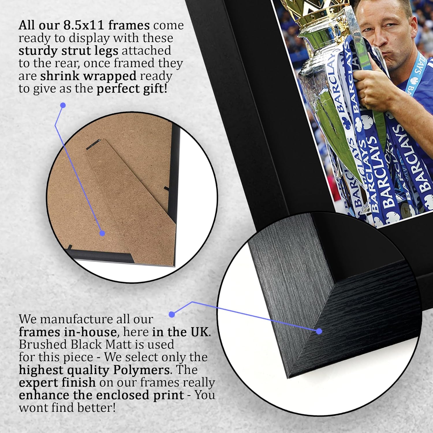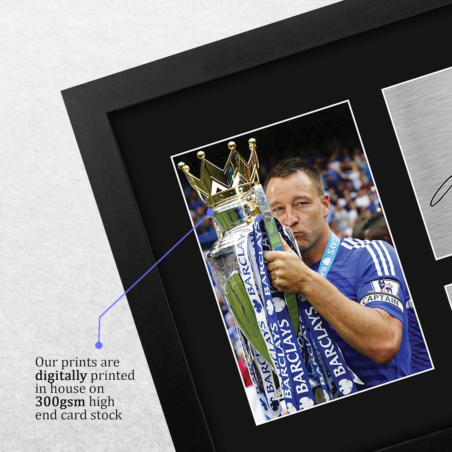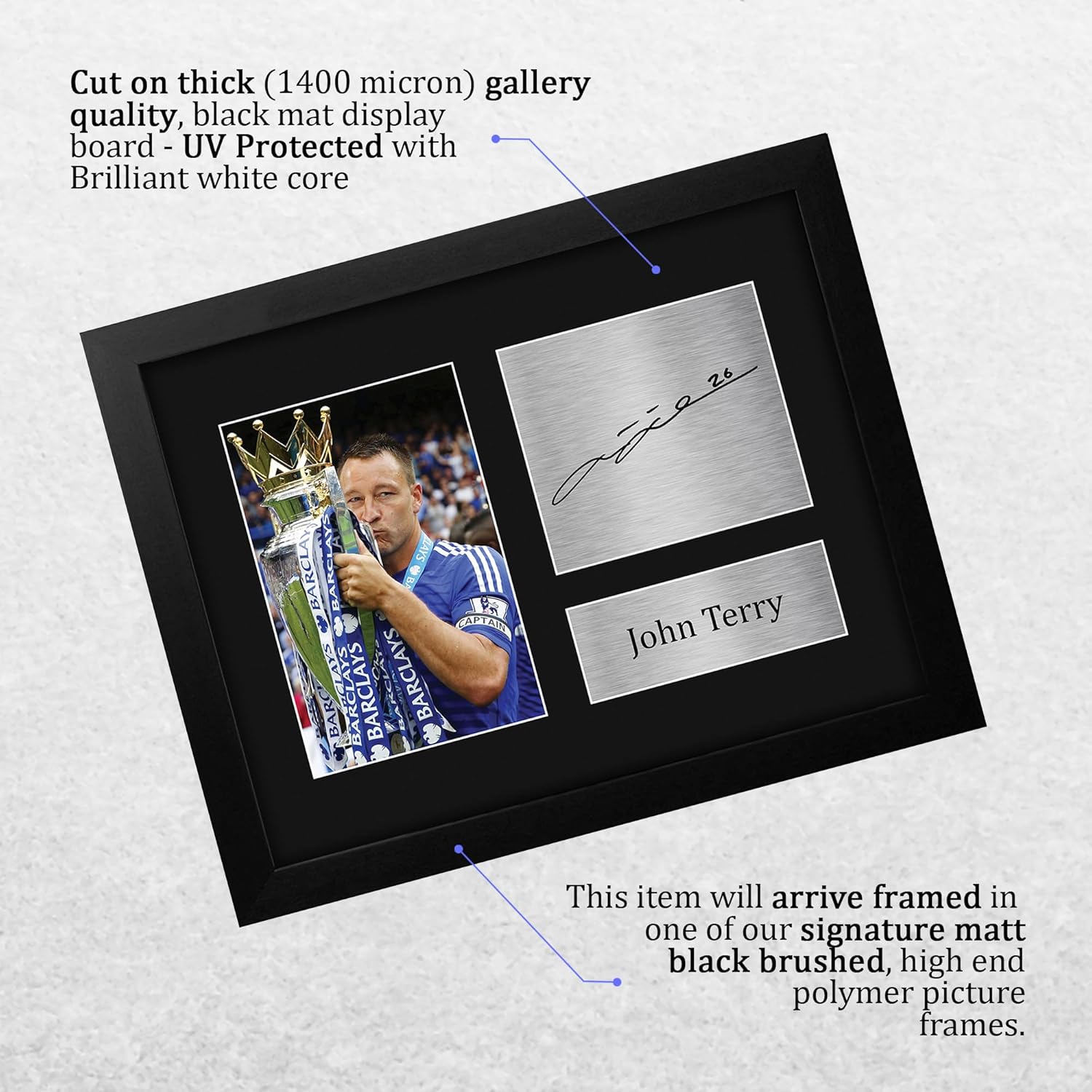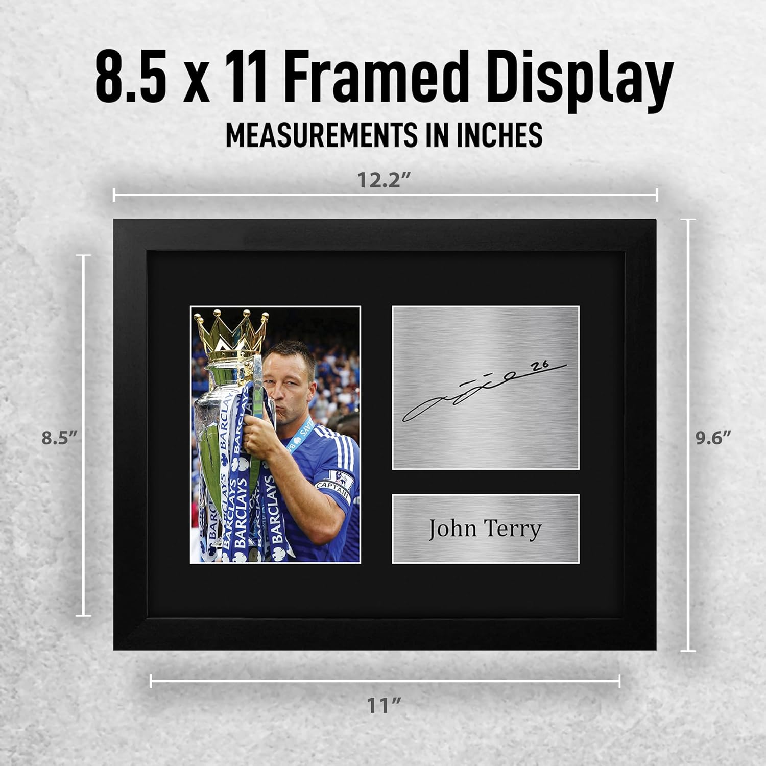 Professionally made in our studio, this Framed John Terry display comes with a high-quality picture of Terry alongside a printed copy of his autograph signature. Mounted in a matt black using an acid-free display board, it’s perfectly finished with Terry’s name in a silver, mock printed plaque. This Print comes Framed in a sleek Black Polycarbonate frame that compliments the matt mount display. Lightweight, but of the highest quality, these make the ideal Christmas/Birthday present for fans of all ages, and best of all, it definitely won’t break the bank!