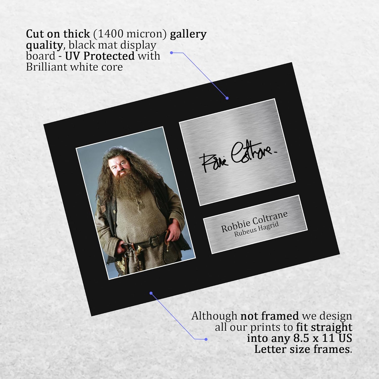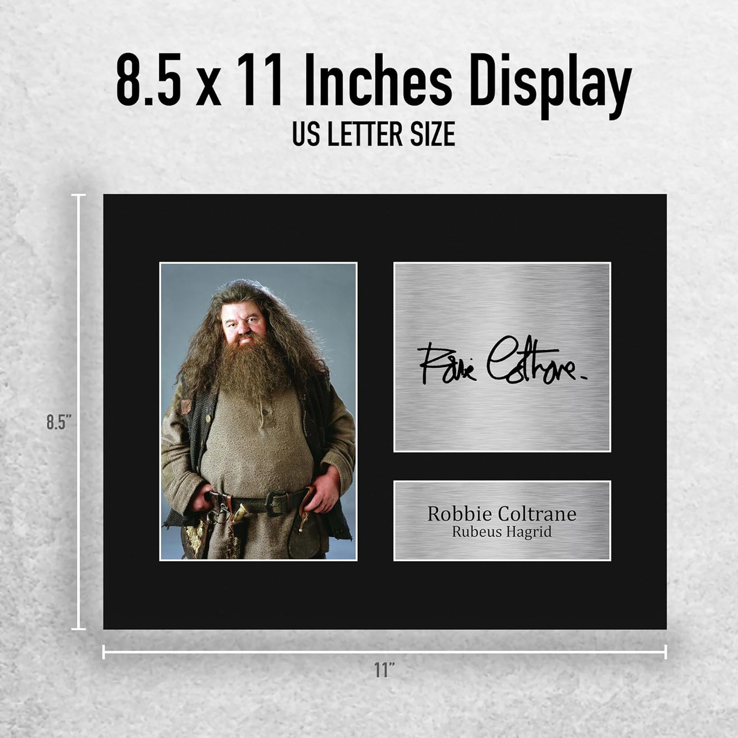 Professionally made in our studio, this Robbie Coltrane display makes for an ideal gift idea. This laser printed quality photograph is mounted in a precision cut three windowed acid-free matt black display board. To the left of the display there is the main image. To the right of the display there are two metallic effect plaque areas for printed copies of the name and autograph signature. These mounts also come with a ridgid backing board making them very sturdy and can be displayed or hung as they are. Alternatively we offer a framed version too. Lightweight, but of the highest quality, these make the ideal Christmas/Birthday gift for fans of all ages, and best of all, they definitely won’t break the bank!