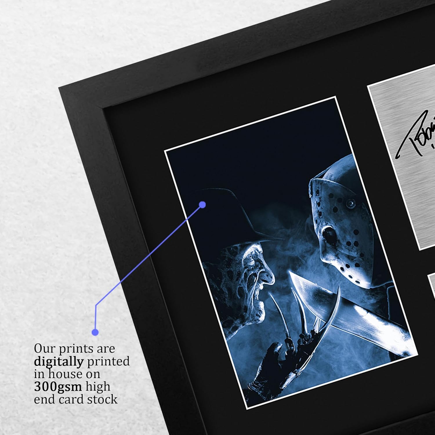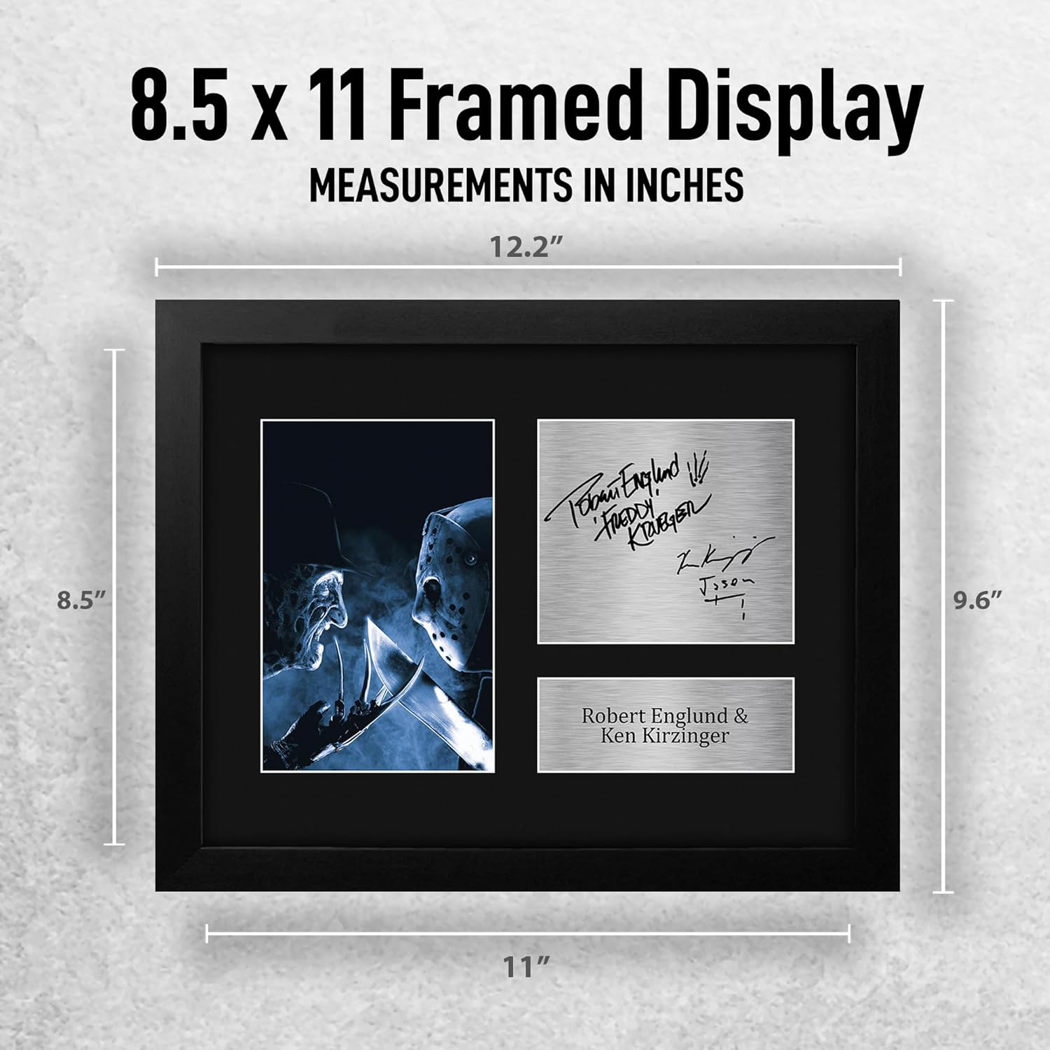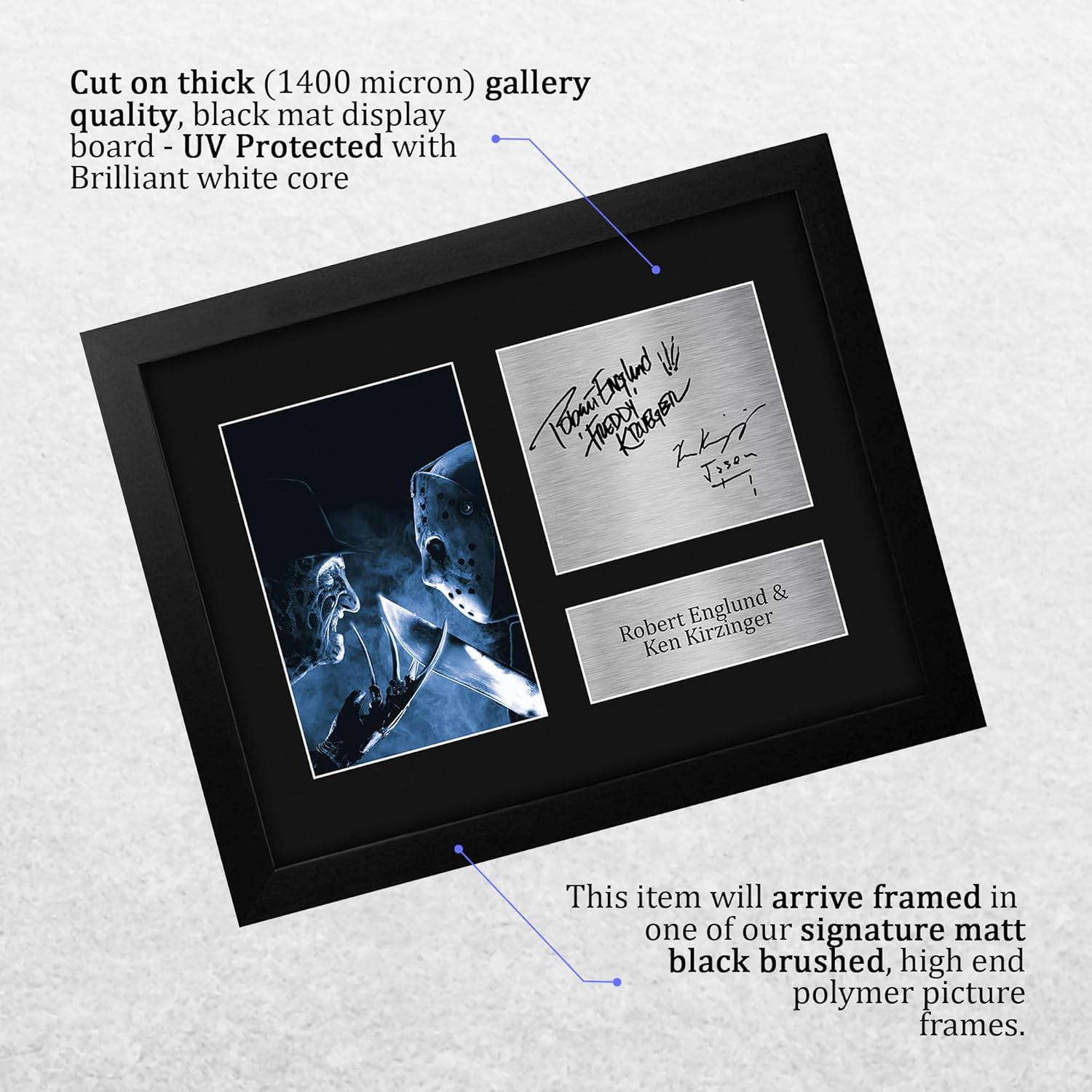 Professionally made in our studio, this Framed Robert Englund & Ken Kirzinger display makes for an ideal gift idea. This laser printed quality photograph is mounted in a precision cut three windowed acid-free matt black display board. To the left of the display there is the main image. To the right of the display there are two metallic effect plaque areas for printed copies of the name and autograph signature. This display comes ready framed in a sleek black polycarbonate frame that compliments the matt mount display and a clear perspex front to keep it dust free and clean. Lightweight, but of the highest quality, these make the ideal Christmas/Birthday gift for fans of all ages, and best of all, it definitely won’t break the bank!