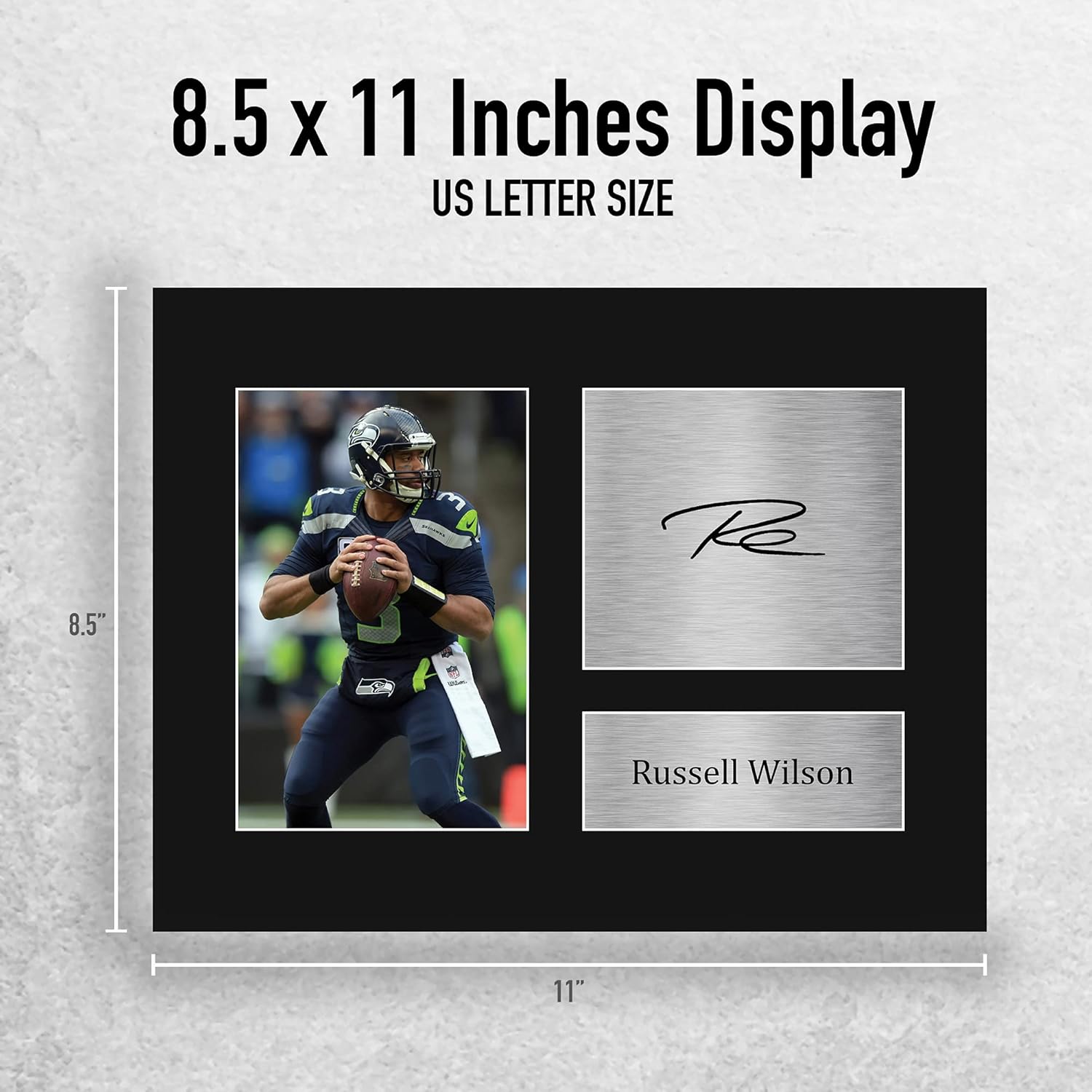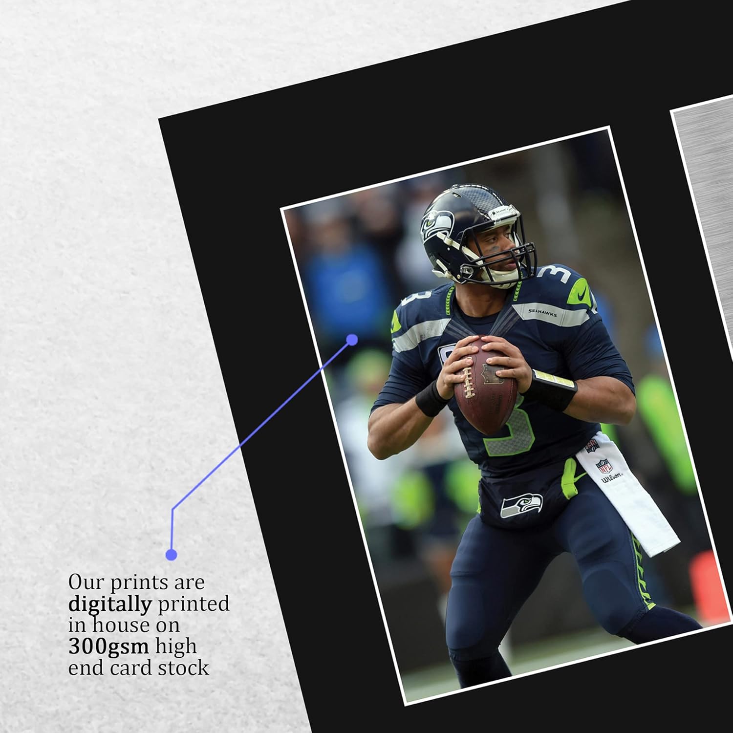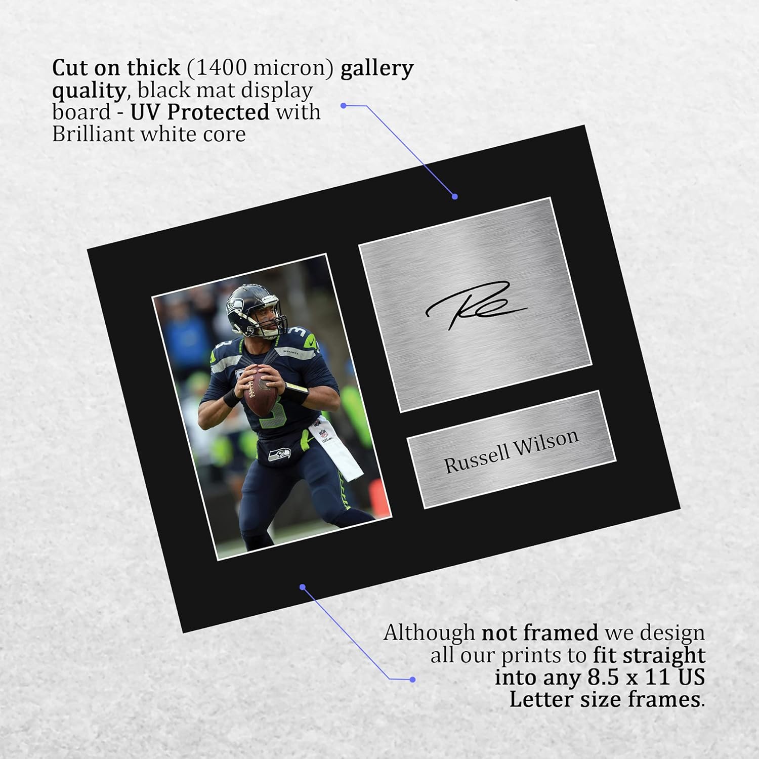 Professionally made in our studio, this unframed Russell Wilson display comes with a high-quality picture alongside printed copies of their famous autograph signature. Mounted in a matt black using an acid-free display board, it’s perfectly finished with an autographed name in a silver, mock printed plaque.Lightweight, but of the highest quality, these make the ideal Christmas/Birthday gift for fans of all ages, and best of all, it definitely won’t break the bank!