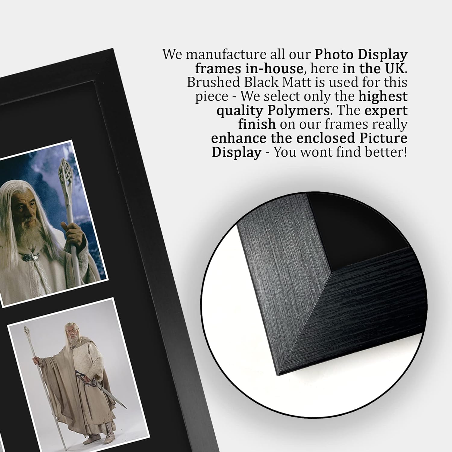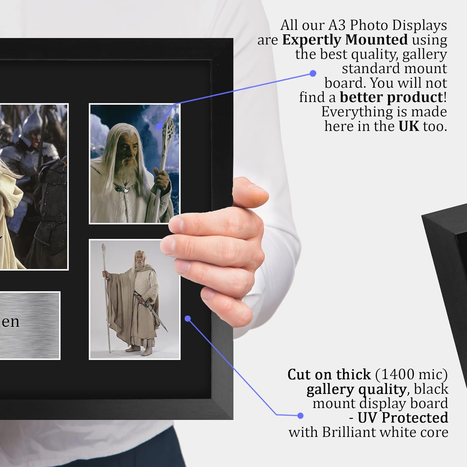 Professionally made in our studio, this 16 x 12 inch (A3) framed Sir Ian McKellen display makes for an ideal gift idea. This laser printed quality photograph is mounted in a precision cut six windowed acid-free matt black display board. To the left and right of the display there are four classic images. To the centre of the display a main focal image taking pride of place with printed signature overlay. Below this is a metallic effect plaque area with the name and career information. This item comes framed in a sleek black polycarbonate frame that compliments the matt mount display and a clear perspex front to keep it dust free and clean. Lightweight, but of the highest quality, these make the ideal Christmas/Birthday gift for fans of all ages, and best of all, it definitely won’t break the bank!