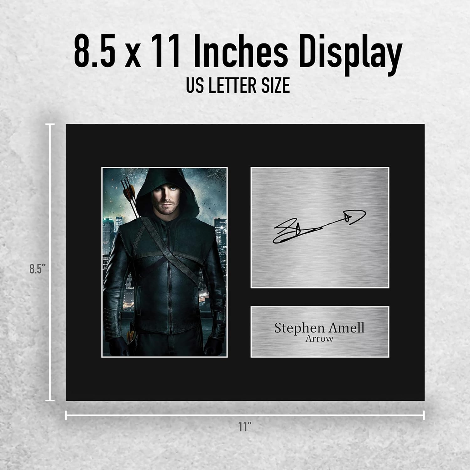 Professionally made in our studio, this US Letter Size (8.5×11 Inch) unframed Stephen Amell display makes for an ideal gift idea. This laser printed quality photograph is mounted in a precision cut three windowed acid-free matt black display board. To the left of the display there is the main image. To the right of the display there are two metallic effect plaque areas for printed copies of the name and autograph signature. These mounts also come with a ridgid backing board making them very sturdy and can be displayed or hung as they are. If you wish to frame them they will fit in any US Letter Size Frame. Alternatively we offer a framed version too. Lightweight, but of the highest quality, these make the ideal Christmas/Birthday gift for fans of all ages, and best of all, they definitely won’t break the bank!