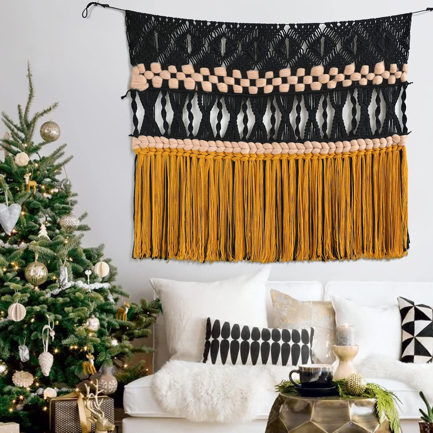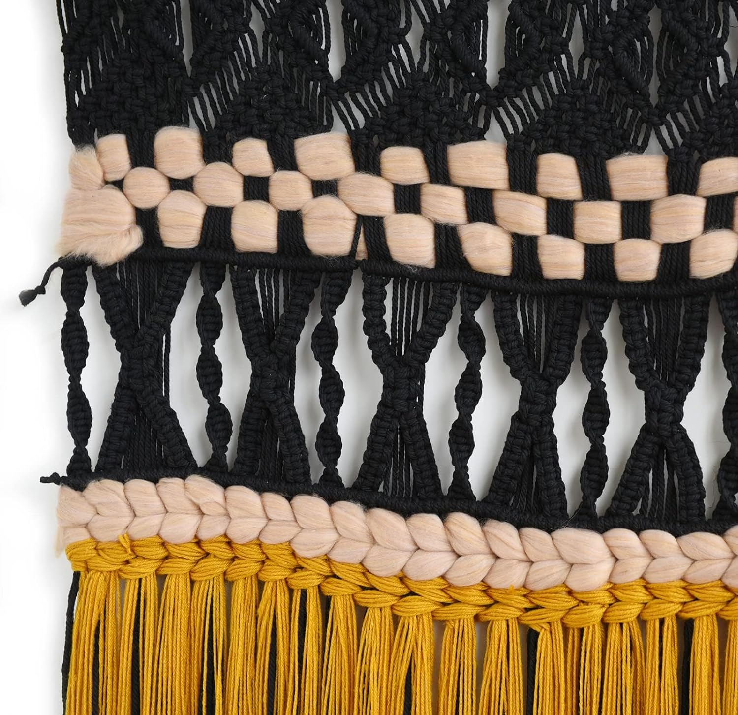Material: -100% 4mm black macrame cord cotton ,wool ,yarn. Size – Macrame Wall Hanging Dimensions: 47″W*35″L Function:- Woven black macrame wall decor is perfectly fit in high mantel, bed headboard, gallery wall ,living room ,gallery wall ,fire place ,baby’s crib etc.-Well packed makes a perfect housewarming,Christmas,Birthday gift for a person who enjoys bohemian art.-Macrame is a fabric craft, all the designs are handmade. Mounting:: -The hanging does not come with a hanging string and can be hung by mounting two nails on the wall for the dowel to rest on or something sturdy to hang it from. you can use wooden dowel rods from the craft store, Iron nails cut to size from the hardware store, acylic rods, driftwood, or peg Wooden found in nature.Warning: Wipe with dry cloth Cotton Rope.After receiving Macrame wall hanging ,tassels yarn will slowly restores its drape or can iron.