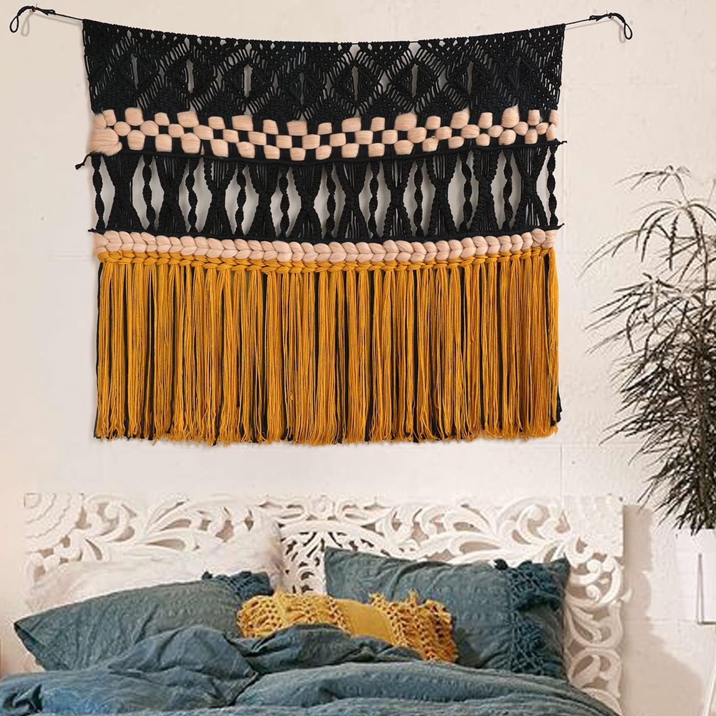 Material: -100% 4mm black macrame cord cotton ,wool ,yarn. Size – Macrame Wall Hanging Dimensions: 47″W*35″L Function:- Woven black macrame wall decor is perfectly fit in high mantel, bed headboard, gallery wall ,living room ,gallery wall ,fire place ,baby’s crib etc.-Well packed makes a perfect housewarming,Christmas,Birthday gift for a person who enjoys bohemian art.-Macrame is a fabric craft, all the designs are handmade. Mounting:: -The hanging does not come with a hanging string and can be hung by mounting two nails on the wall for the dowel to rest on or something sturdy to hang it from. you can use wooden dowel rods from the craft store, Iron nails cut to size from the hardware store, acylic rods, driftwood, or peg Wooden found in nature.Warning: Wipe with dry cloth Cotton Rope.After receiving Macrame wall hanging ,tassels yarn will slowly restores its drape or can iron.
