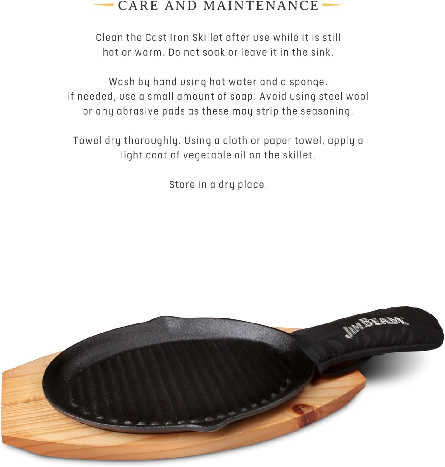 Jim Beam JB0159, Heavy Duty Construction, Pre Seasoned Cast Iron Skillet with Wooden Base and Mitt, Black,Small