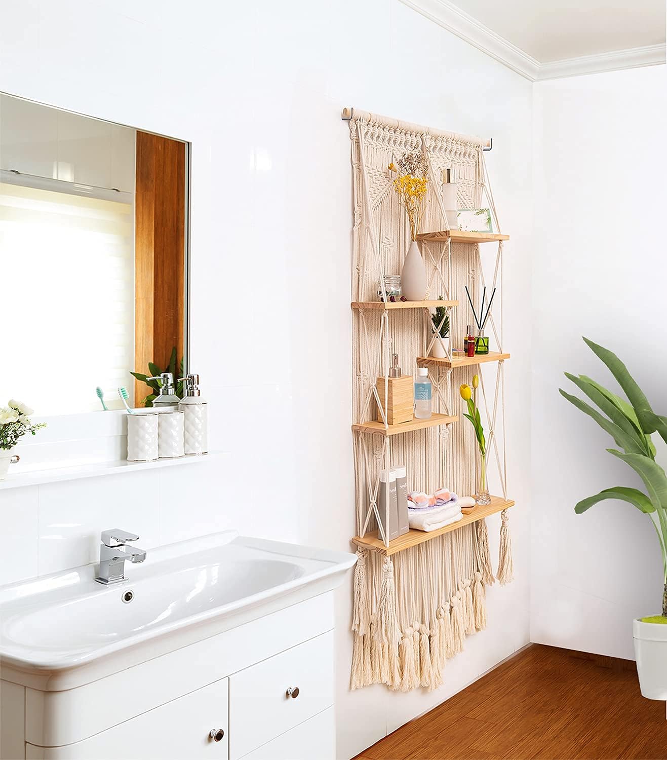 ❤Upgrade to Larger and More Storage Space: This Macrame Hanging Shelf features, Open, 5 solid wood shelves, ~24″x6″ x 63″(W x D x H), with a back of bohemian macrame wall hanging and chic design with tassels works as a great addition to your room. This elegant boho shelf is not only a perfect boho wall decoration but also an ideal storage solution! Such be used as a storage shelf, flower stand, plant shelf, or display rack, floating shelf, bookshelf, etc.