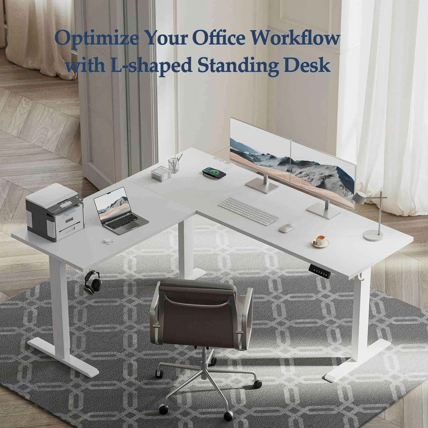 【Spacious L-Shaped Workstation in Multiple Sizes】Maximize corner space with our L-shaped standing desk, available in 59″, 63″, and 75″ lengths. The spacious dual-surface desktop offers ample room for multi-monitor setups, printers, and accessories—ideal for home office, study, or gaming.