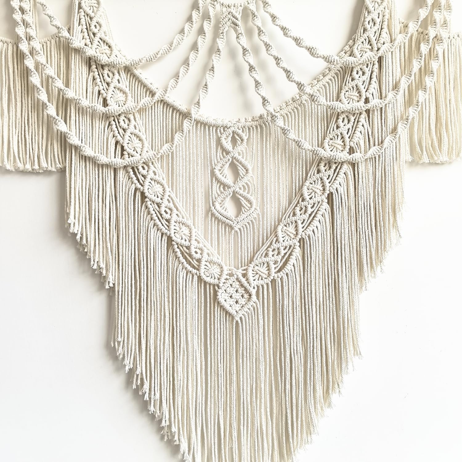 Large Woven Tapestry: 43” W x 32” H (from top to the ends of longest fringe) This macrame wall hanging is great for a bedroom, living area, workspace, or anywhere where you’d like to bring some texture and interest to your walls.