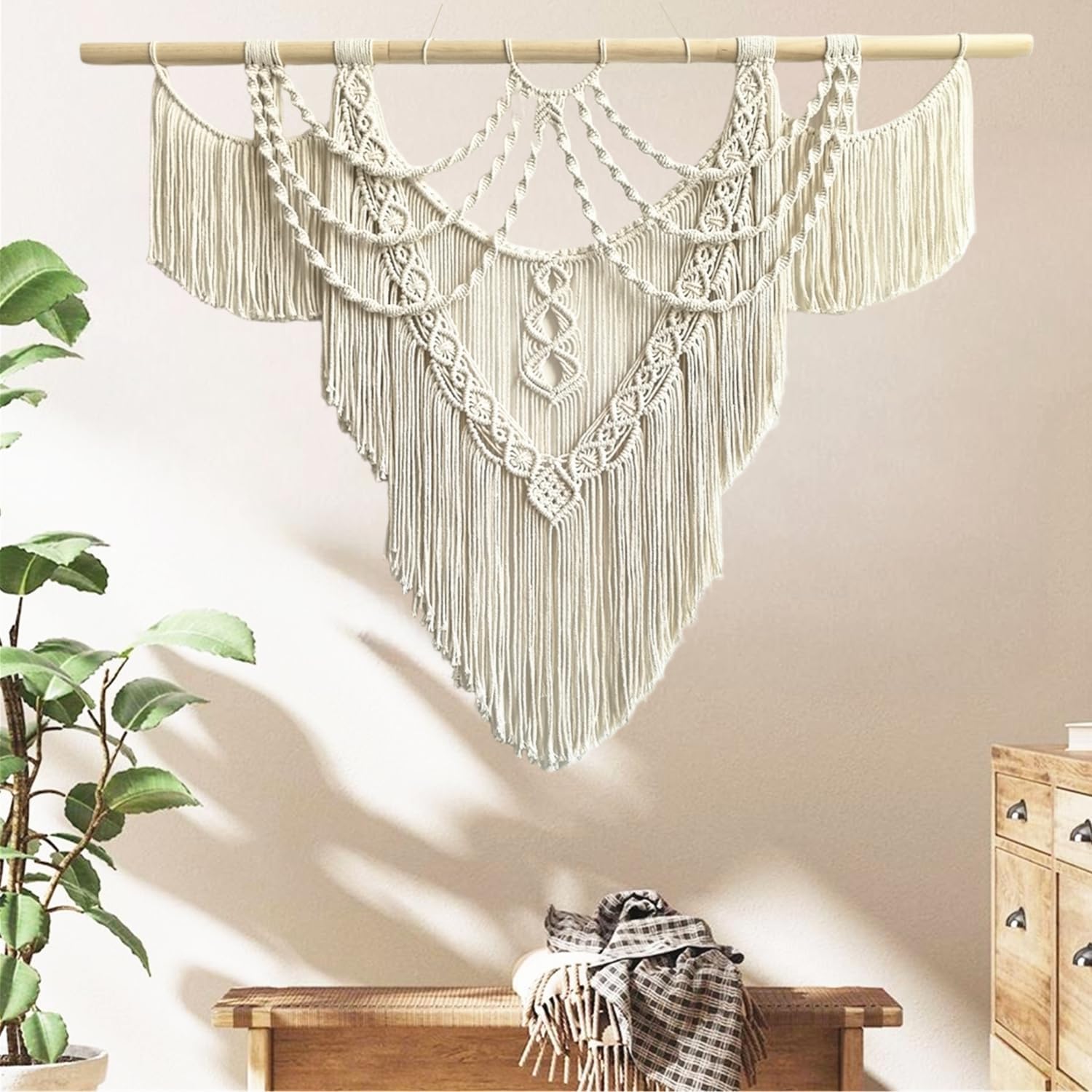 Easy to assemble: A tapestry of 43”x32” inches and 3 pieces of spliced wooden Dowel, which could be easily connected together with the screws inserted in the wood to become 1 large macrame piece.