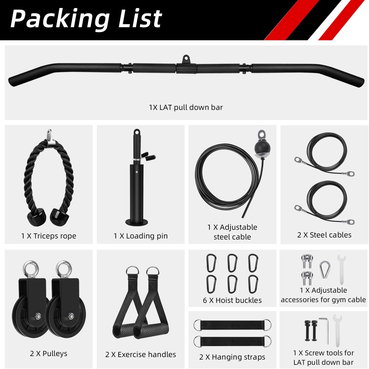 Easy to Assemble: LAT pull down cable machine can be easily connected to the power frame, squat rack, pull-up bars, cable machine, beams and any place where the strap can be installed. You can work out in your home gym, garage, training room and so on.