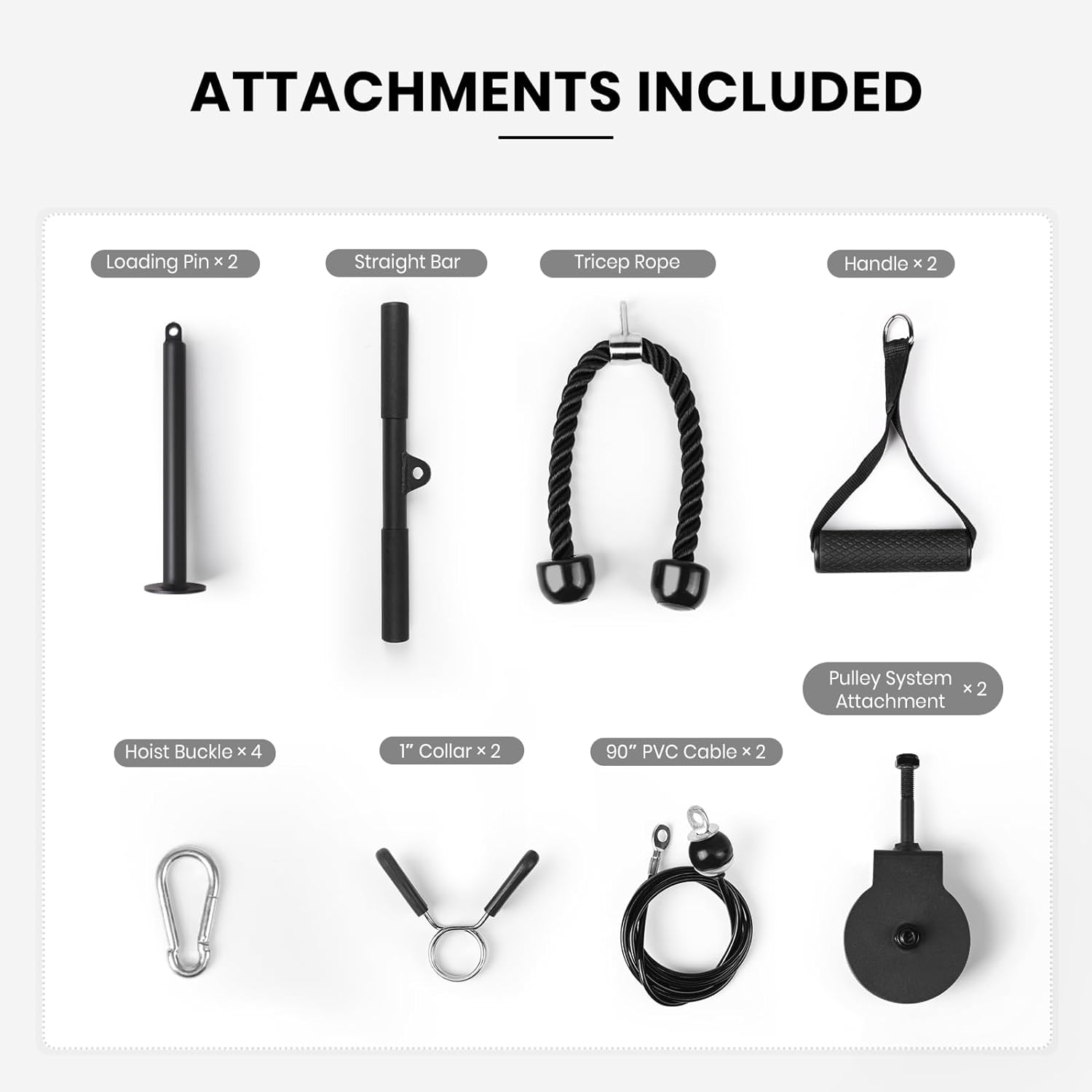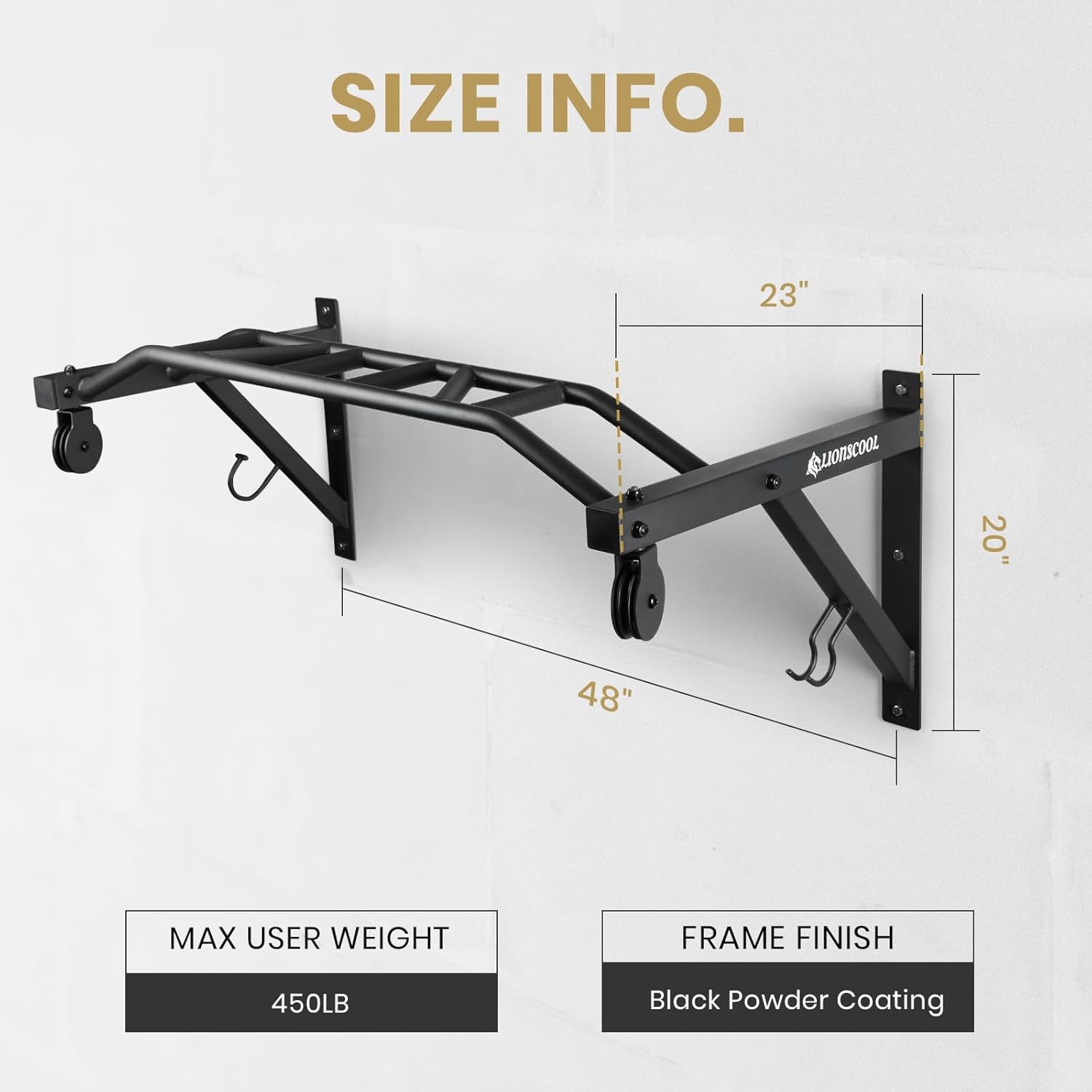 STEP UP YOUR FITNESS GAME: Reach New Heights of Strength and Flexibility with the LIONSCOOL Multi-Grip Pull-Up Bar with Pulley System. The pulley system combines a swivel pulley with a PVC encased cable, a 1” loading pin and a tricep rope. With its versatile pulley system, you can further enhance upper body strength, sculpting a well-defined upper body.