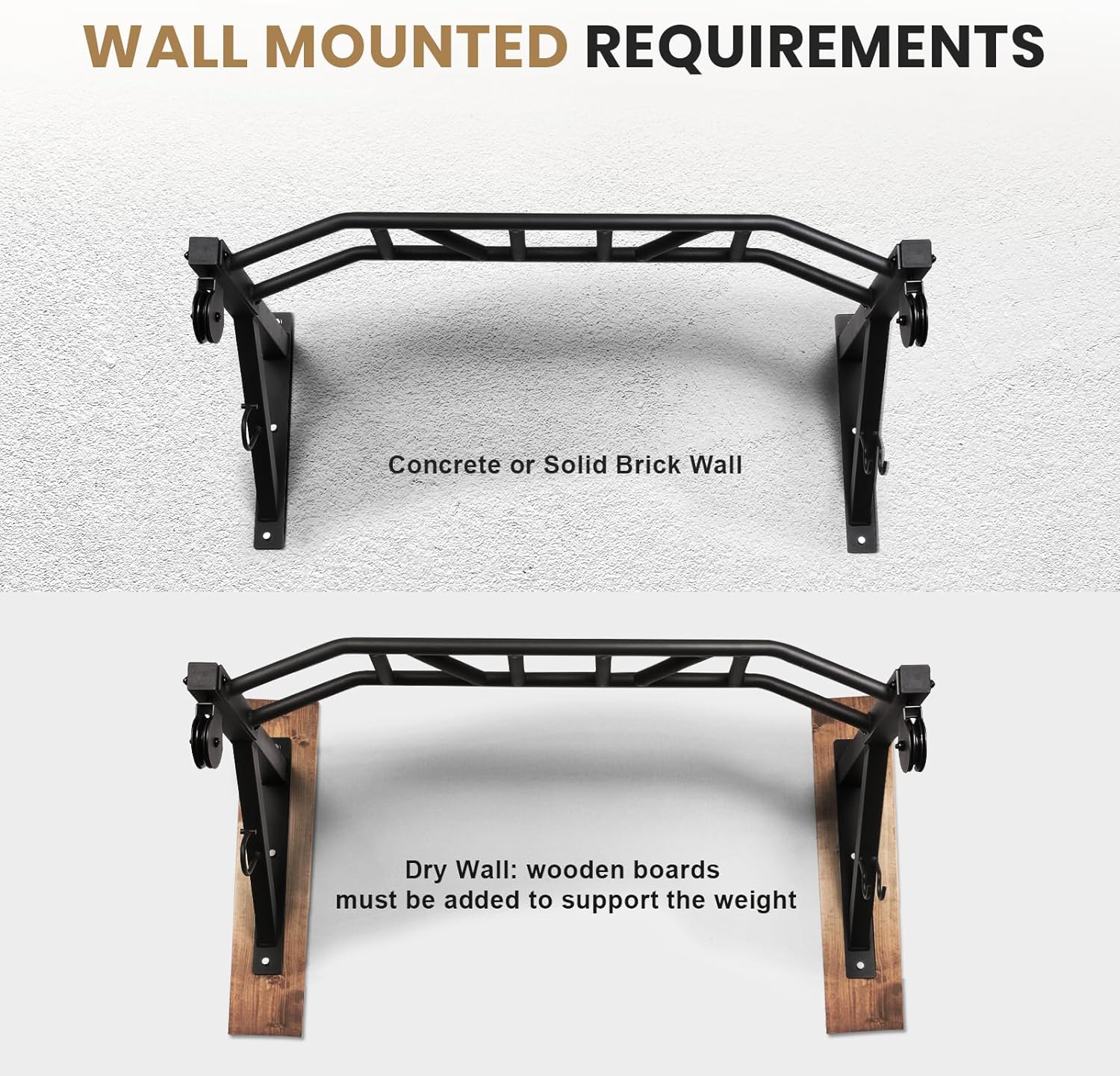 WALL MOUNTING REQUIREMENTS: Experience greater flexibility with the LIONSCOOL pull-up bar, offering stud space options of 16″ or 24″ for personalized installations based on individual needs and space constraints. We recommend mounting the bar on a cement or solid brick wall for optimal support. If installing on drywall, additional wooden boards are advised to prevent cracking. The installation is easy with all the necessary installation components and detailed instruction included in the package.