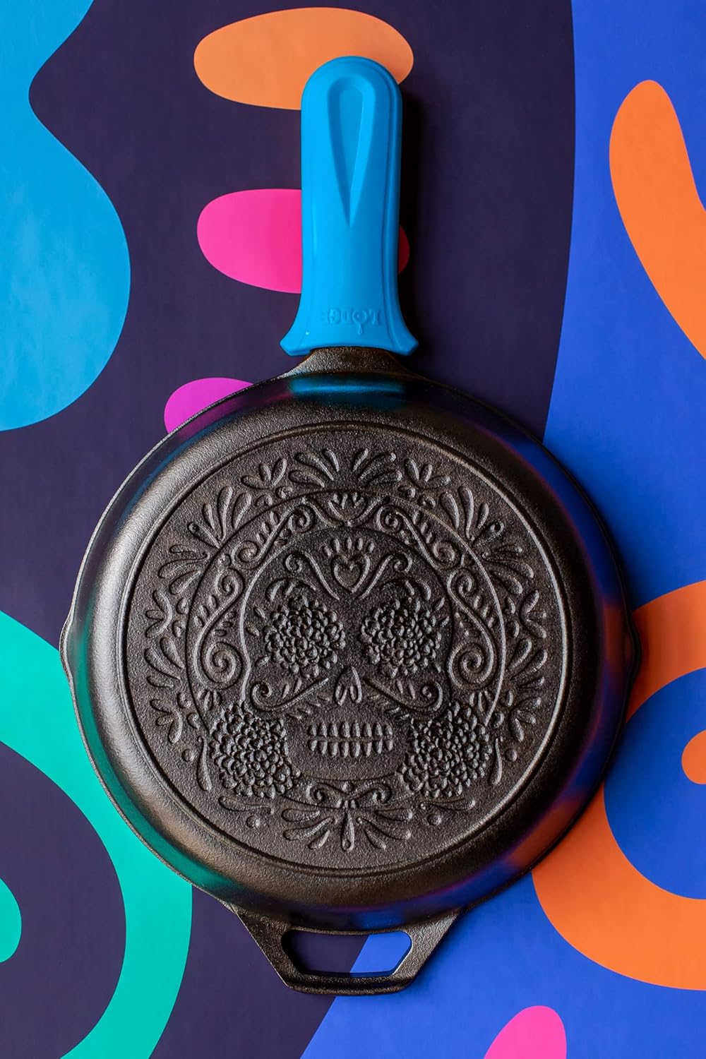 YOUR NEW GO-TO STAMPED PAN: The Lodge Sugar Skull Cast Iron Stamped Skillet and the Lodge Electric Blue Silicone Hot Handle Holder are the perfect kitchen tools for beginners, home cooks and chefs. Cast iron can handle any kitchen cooktop, oven, grill, and open flame. Pairing with the durable hot handle holder not only adds a pop of color to your kitchen but protects your hands from heat up to 500°.