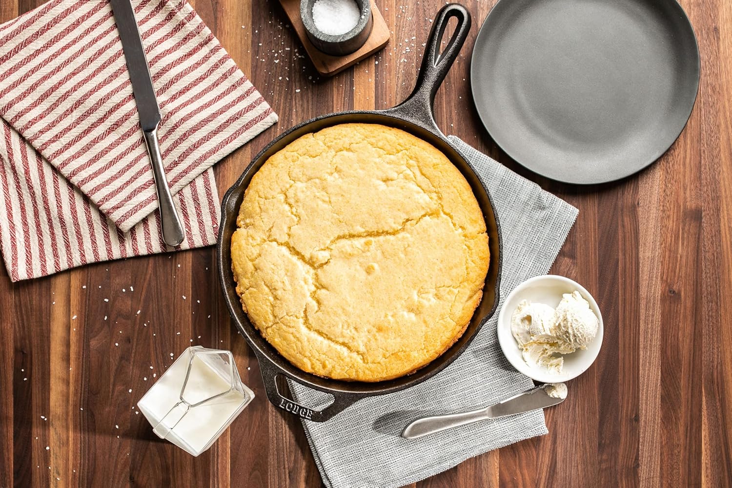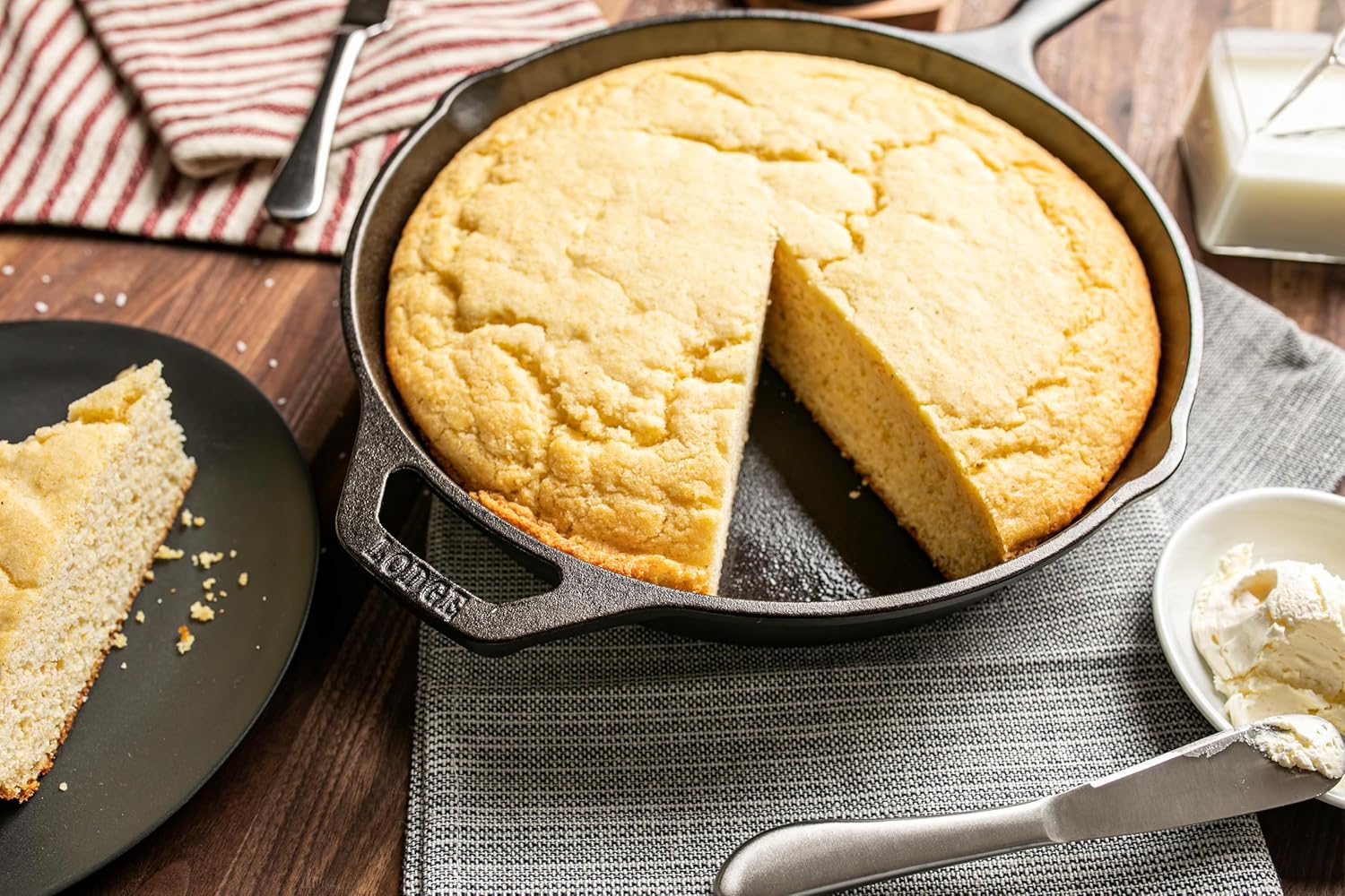 DELICIOUSLY SIMPLE CORNBREAD AT HOME: Simply lightly grease your cast iron cookware of choice, whisk 3 large eggs, 1 cup of whole milk, and 1/4 cup of canola oil together in a bowl. Add the cornbread mixture, whisking until smooth. Pour into pan and bake until golden brown.