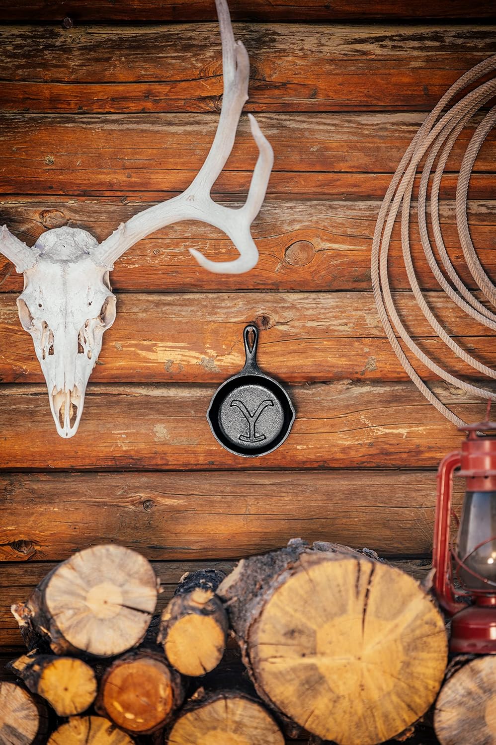 Lodge Pre-Seasoned Yellowstone Stamped Cast Iron Cookware – Signature Teardrop Handle – Use in the Oven, on the Stove, on the Grill, or Over a Campfire – Power Y 5 Inch Skillet