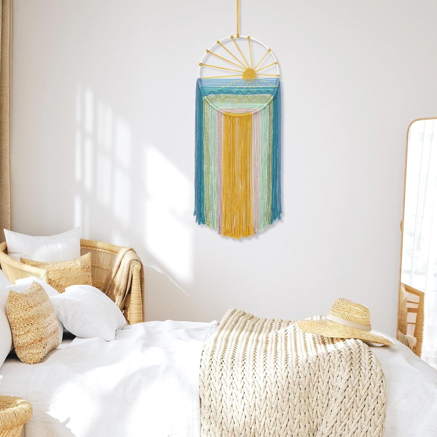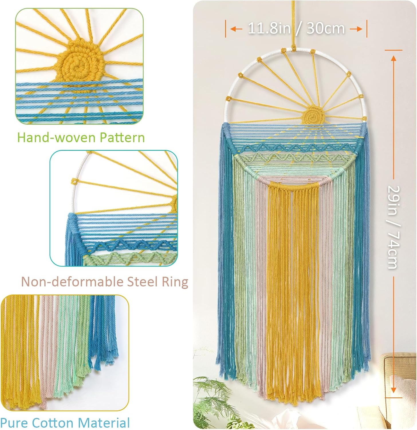☀️【MEANINGFUL GIFT】This colorful boho sunny dream catchers decorations with positive connotations is ideal for gifting to friends and family who love bohemian wall decor. Unique boho tapestry decor is also a perfect gift for those who love handmade crafts. The macrame hanging tapestry can also be used as a decoration and ideal gift for wedding receptions, holidays, housewarming parties, birthdays and more.
