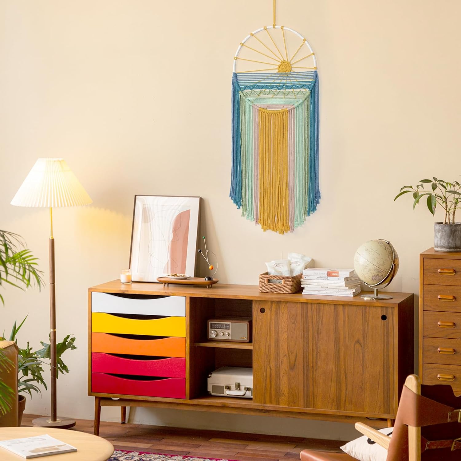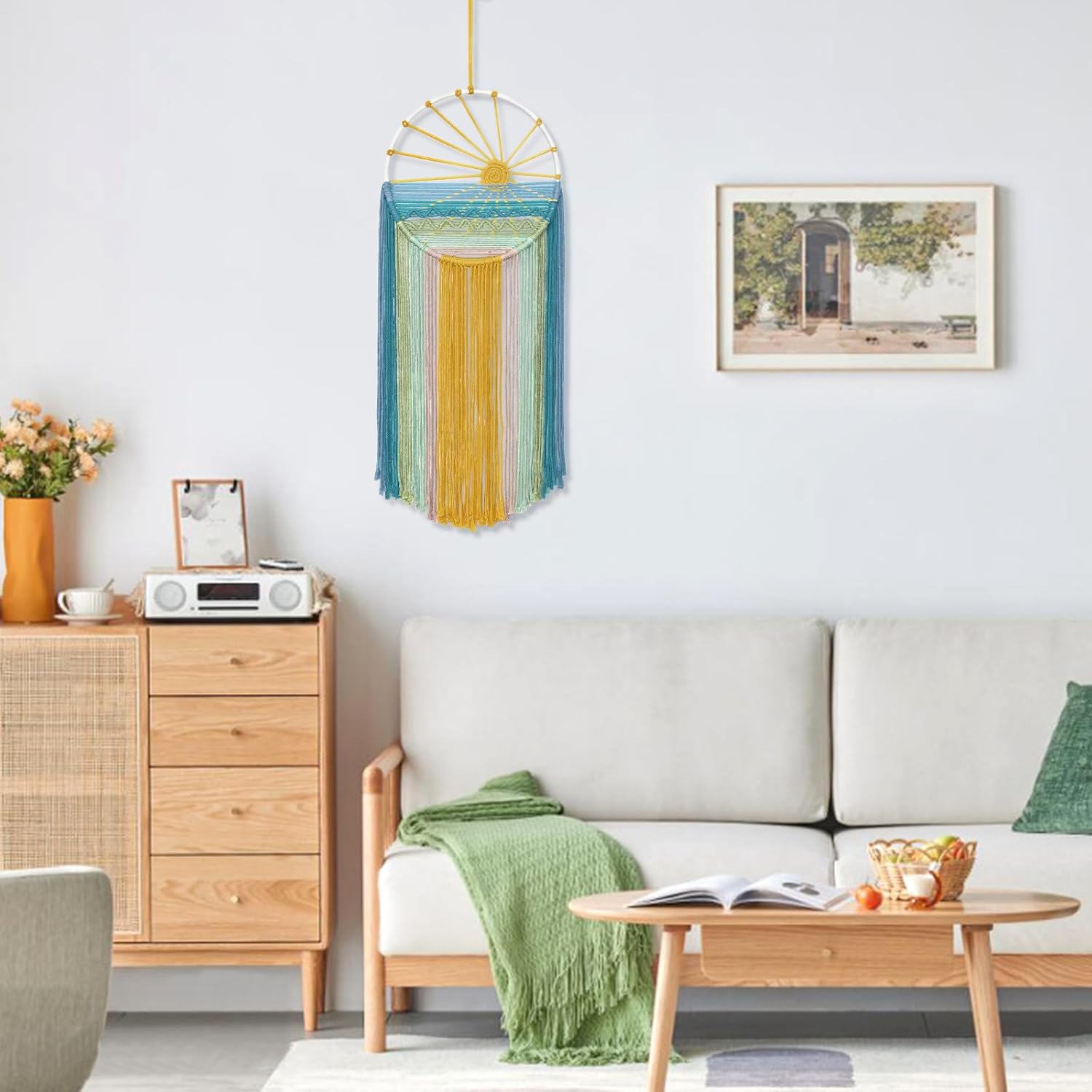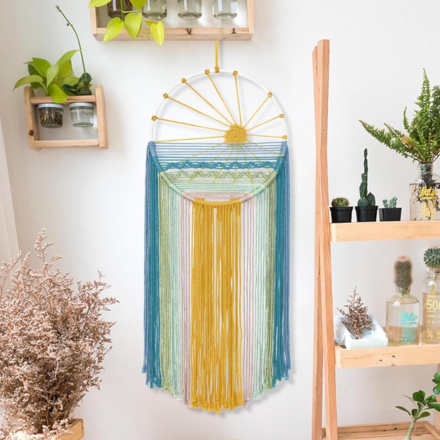 ☀️【HIGH QUALITY MATERIAL】The macrame wall hanging tapestry is made of cotton material, hand-woven with exquisite craftsmanship. The boho tapestry wall hanging decor is designed with wooden hanging rod, safe and stable. The colorful tapestry is lightweight, not easy to deform, nor easy to break or fade. Environmentally friendly and odourless. Can add a splash of colour to any space. Each package contains a sunset tapestry and a nail.