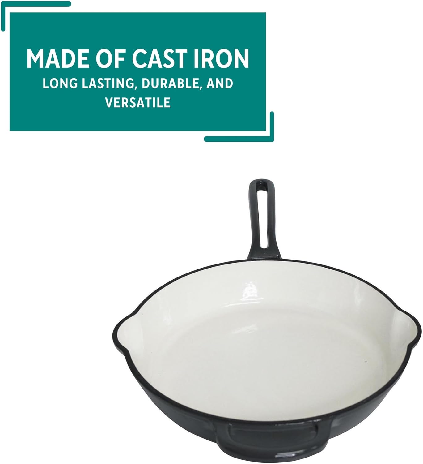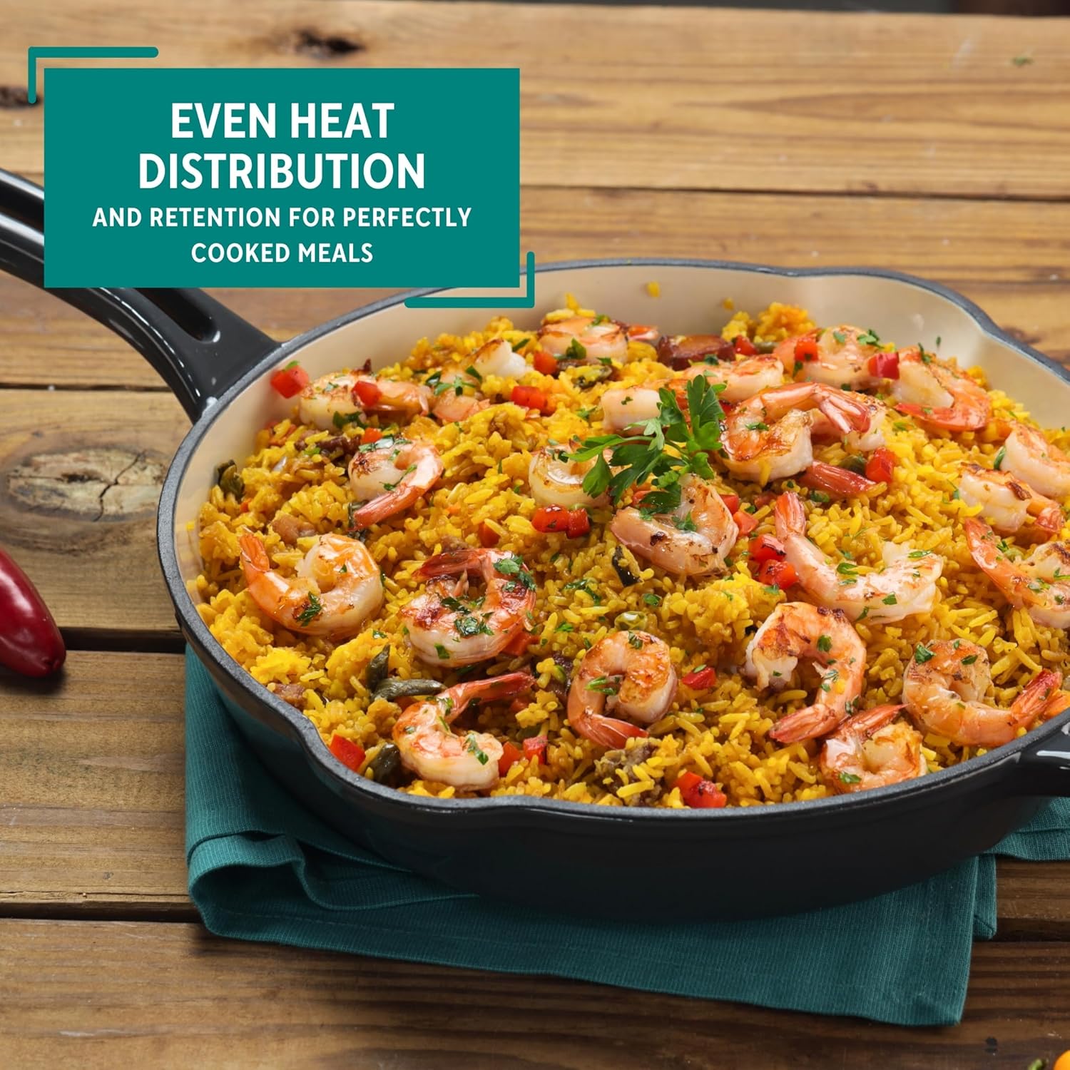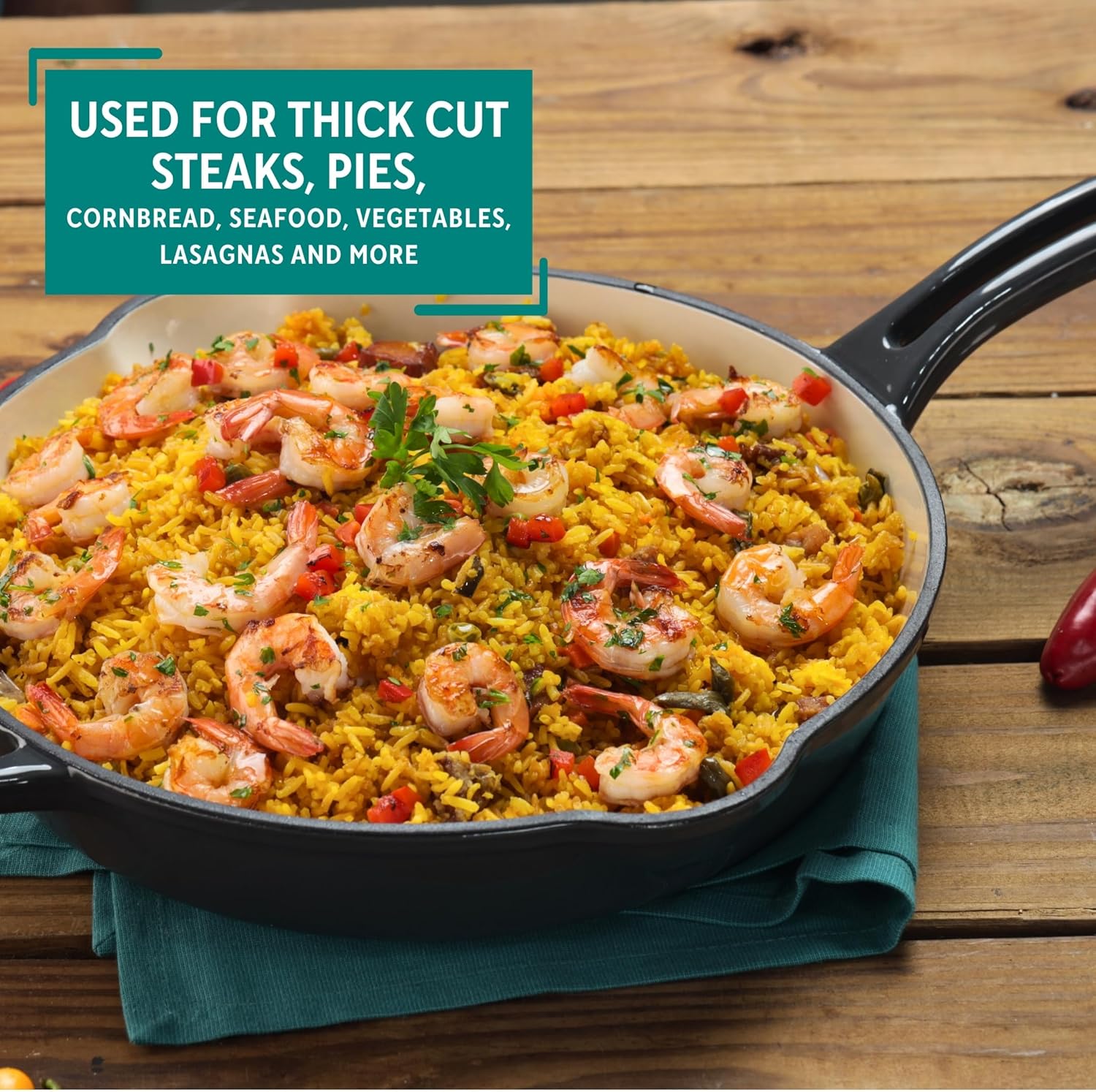 GENEROUS 12” COOKING SURFACE: This 12” enamel cast iron skillet is perfect for large meals, providing even heat distribution for thick-cut steaks, cornbread, pies, seafood, and more