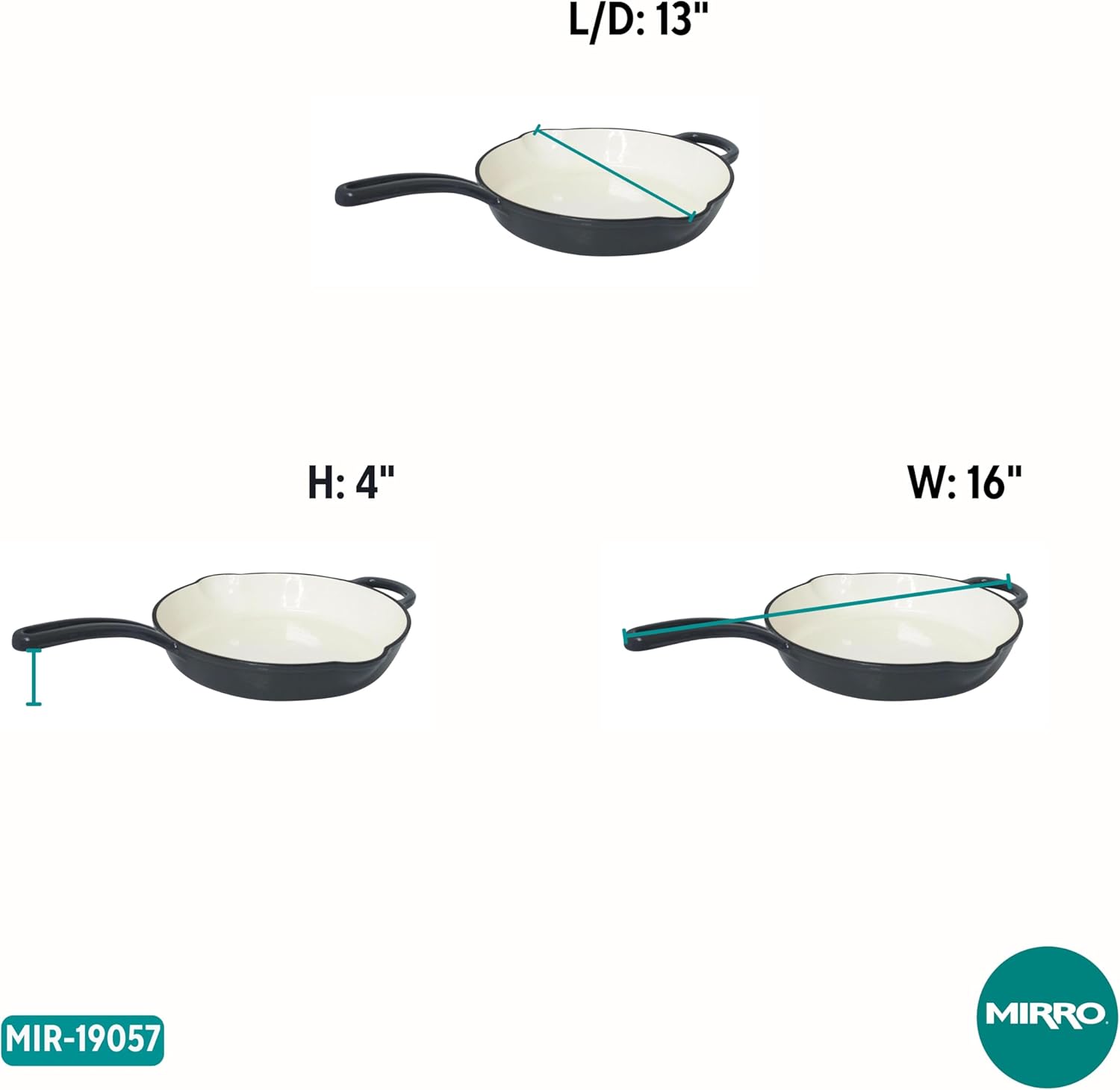 The Mirro 12″ Cast Iron White Enamel Coated Interior Skillet makes traditional cooking a snap! Cast Iron is perfect for stove top and/or oven use as it is highly heat resistant. The sturdy construction is made to last a lifetime. It is easy to clean, with a beautiful and durable enameled finish, our Mirro skillet dispenses and retains heat evenly. Long-lasting, rust-free, and is easy to clean with its convenient pour spouts to drain sauces and drippings effortlessly. It is not intended to be washed in the dishwasher. Oven-safe to 500 degrees F. Make your favorite pancakes, eggs, sandwich, tortillas or quesadillas with your Mirro skillet. It can be used for sautéing, searing, pan-frying, baking, broiling, roasting, and even more! Cast iron cookware distributes and retains heat evenly. Use wooden, silicon, or nylon utensils for the best care as metal can scratch. With a beautiful and durable enameled finish this skillet is stylish enough for stove-to-oven-to-table serving.Frame Material:No frame