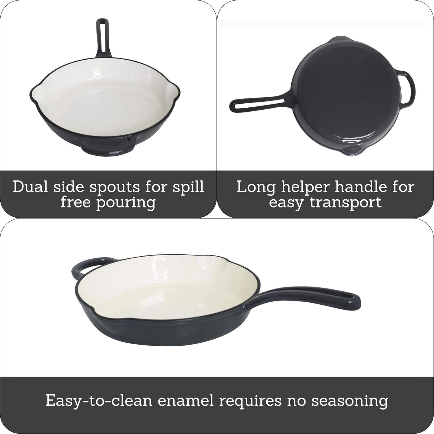 SLEEK AND DURABLE DESIGN: Made of cast iron with a gray exterior and cream interior, this skillet features an easy-to-clean enamel coating, dual spouts for spill-free pouring, and a helper handle for easy transport