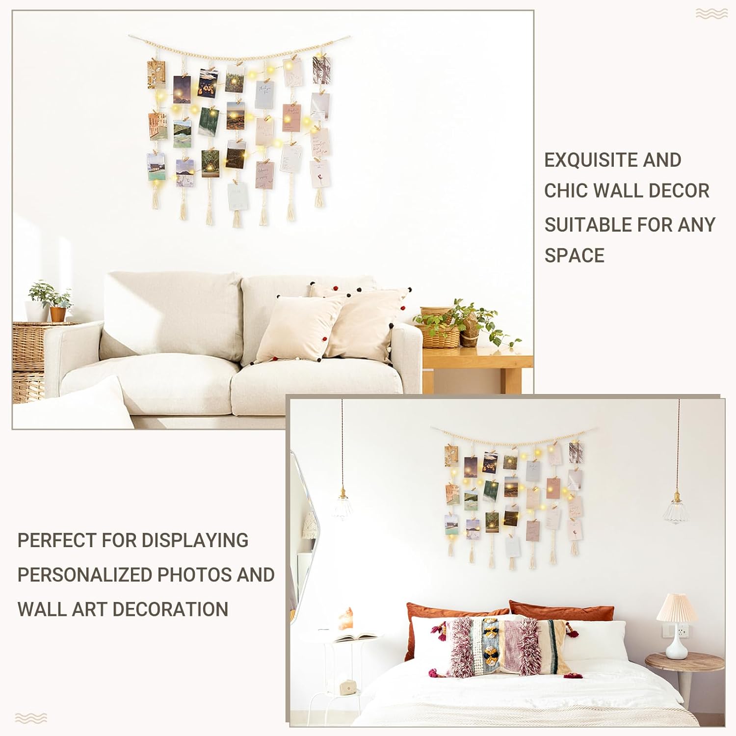 The wall art, which has a chic outlook, uses a high quality string threaded through beads as a chain, with each vertical strand woven from macrame. It comes with 45pcs removable wood clips, so you can display photos or artwork in different sizes on the string as you like. And the string lights are as soft as copper wire, so you are free to wind the shapes of the string lights into the macrame as you like.