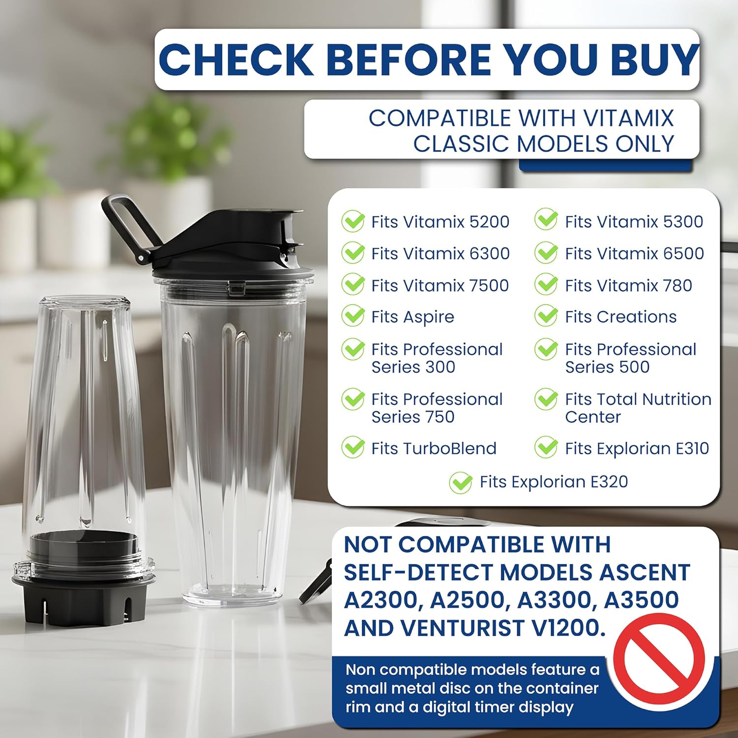 NOT COMPATIBLE WITH SELF-DETECT MODELS: Not compatible with Vitamix Ascent or Venturist Self-Detect blenders. These models require chip-enabled containers; this adapter and cups do not include a chip, so the blender will not run. These models can also be identified by a small metal disc on the container rim and usually have a digital timer display on the base.