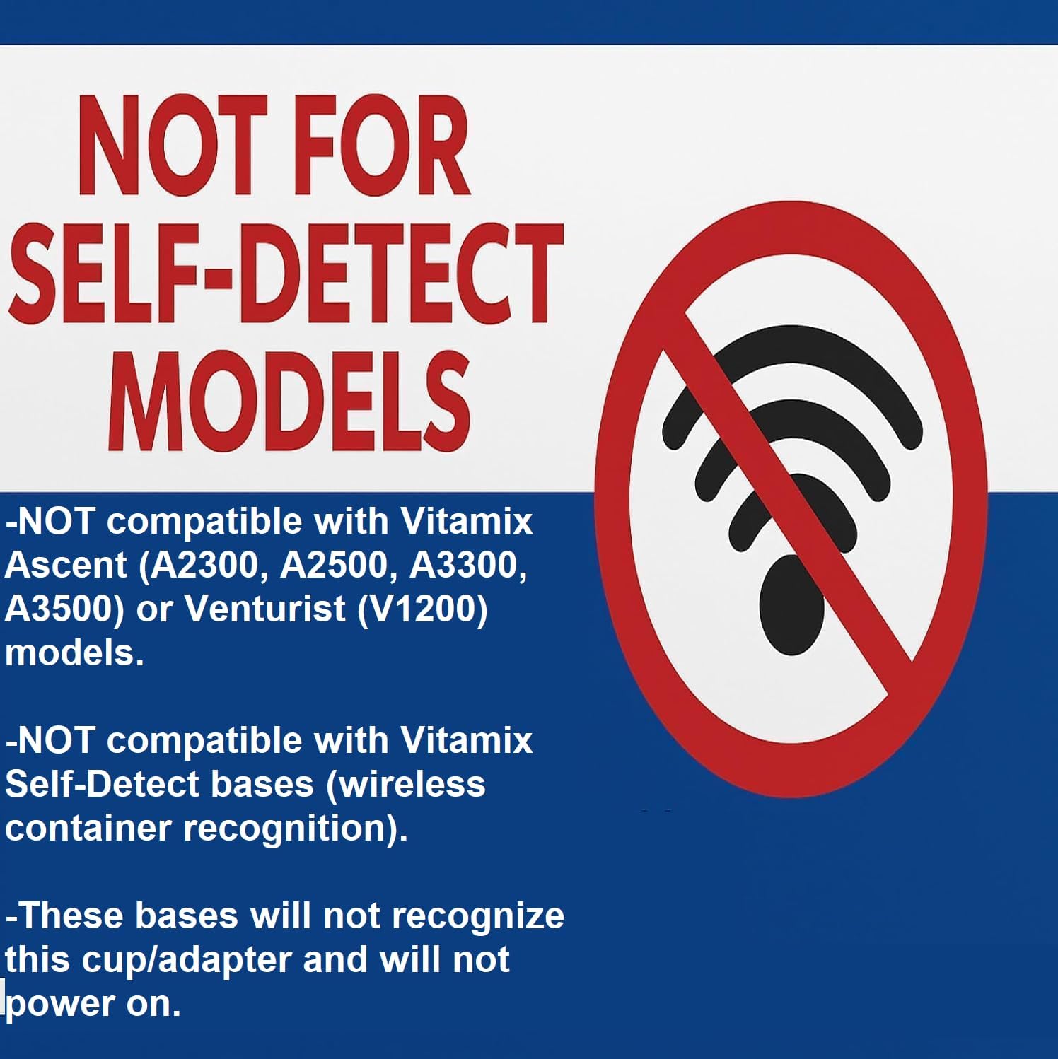 NOT COMPATIBLE WITH SELF-DETECT MODELS: Not compatible with Vitamix Ascent or Venturist Self-Detect blenders. These models require chip-enabled containers; this adapter and cups do not include a chip, so the blender will not run. These models can also be identified by a small metal disc on the container rim and usually have a digital timer display on the base.