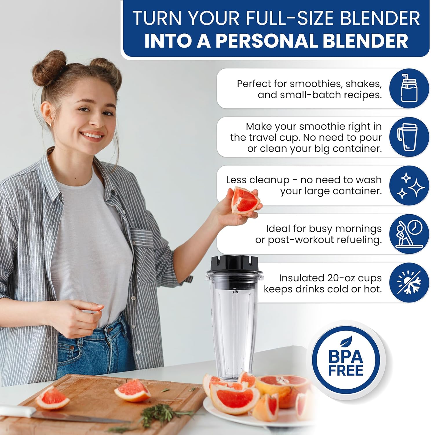 PERSONAL BLENDING WITH YOUR FULL-SIZE BLENDER: Compatible with Vitamix Classic Series blenders to make single servings directly in the insulated 20-oz cups, then cap and go. Ideal for smoothies, shakes, and small batch recipes.