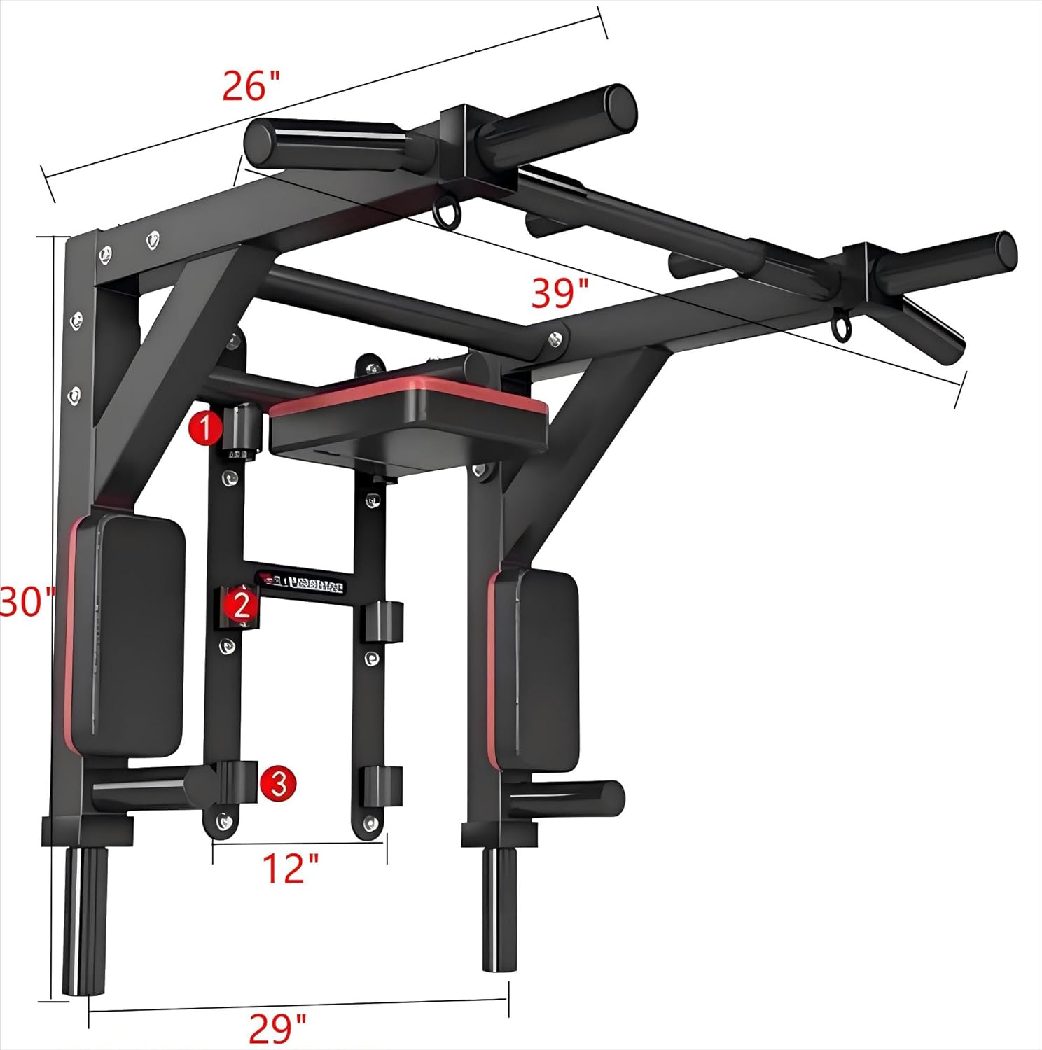 đȘăMultifunctional Strength TrainingăWall mounted pull up bar can support many kinds of sport exercise like pull ups, chin ups, dip station, leg raises and boxing. Perfect for exercising your backs, shoulder, chest, arms, triceps, biceps, lats, and the front of your abs ,supports up to 600LBS.