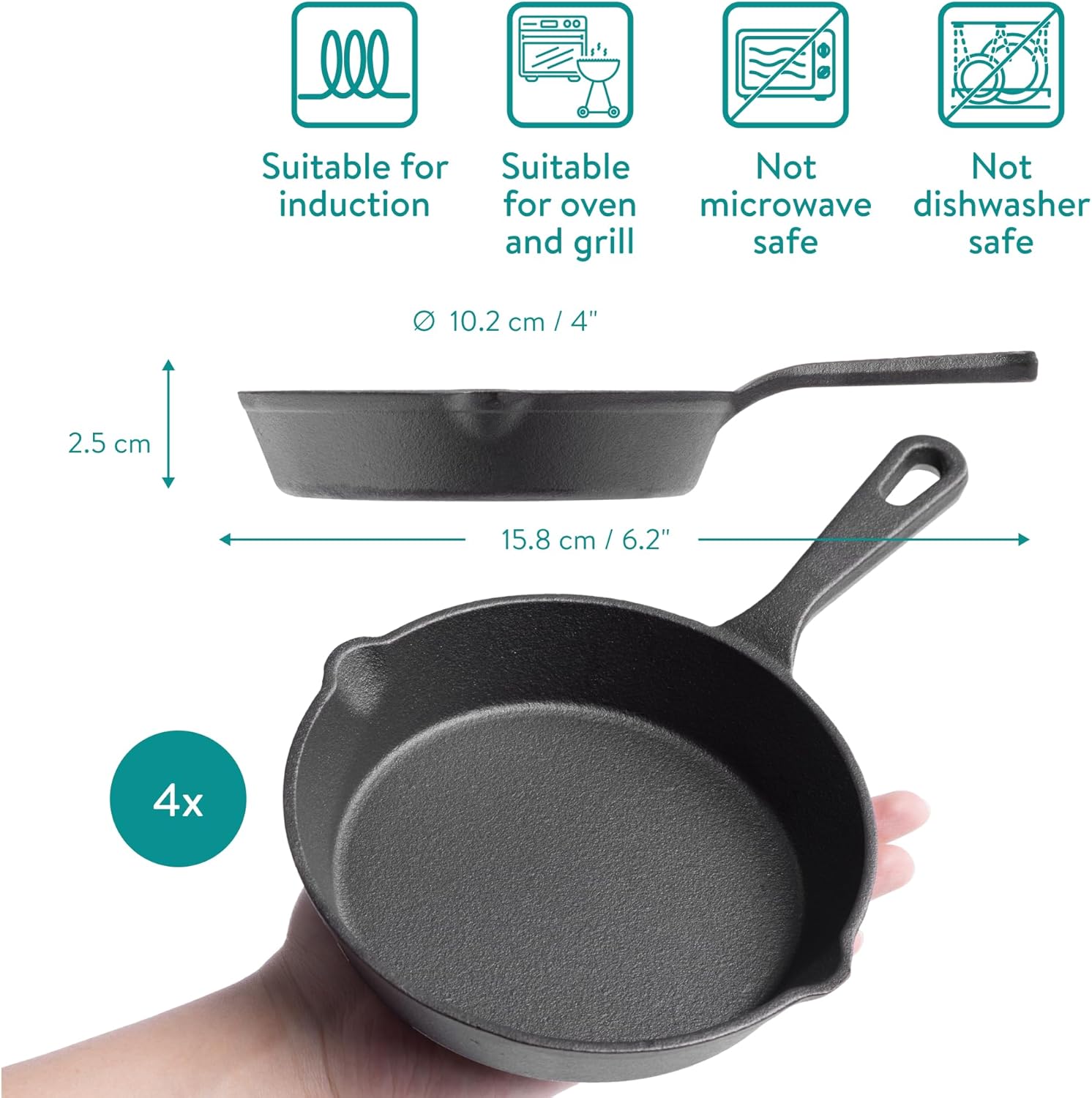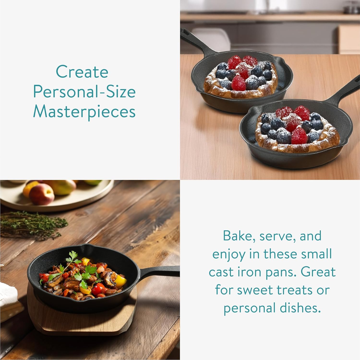 Navaris Cast Iron Skillet with Wooden Base (Set of 2) – Cast Iron Frying Pan Small Skillet with Protective Wood Base – Heavy Duty Metal Skillet Pans – 6″ (15cm)