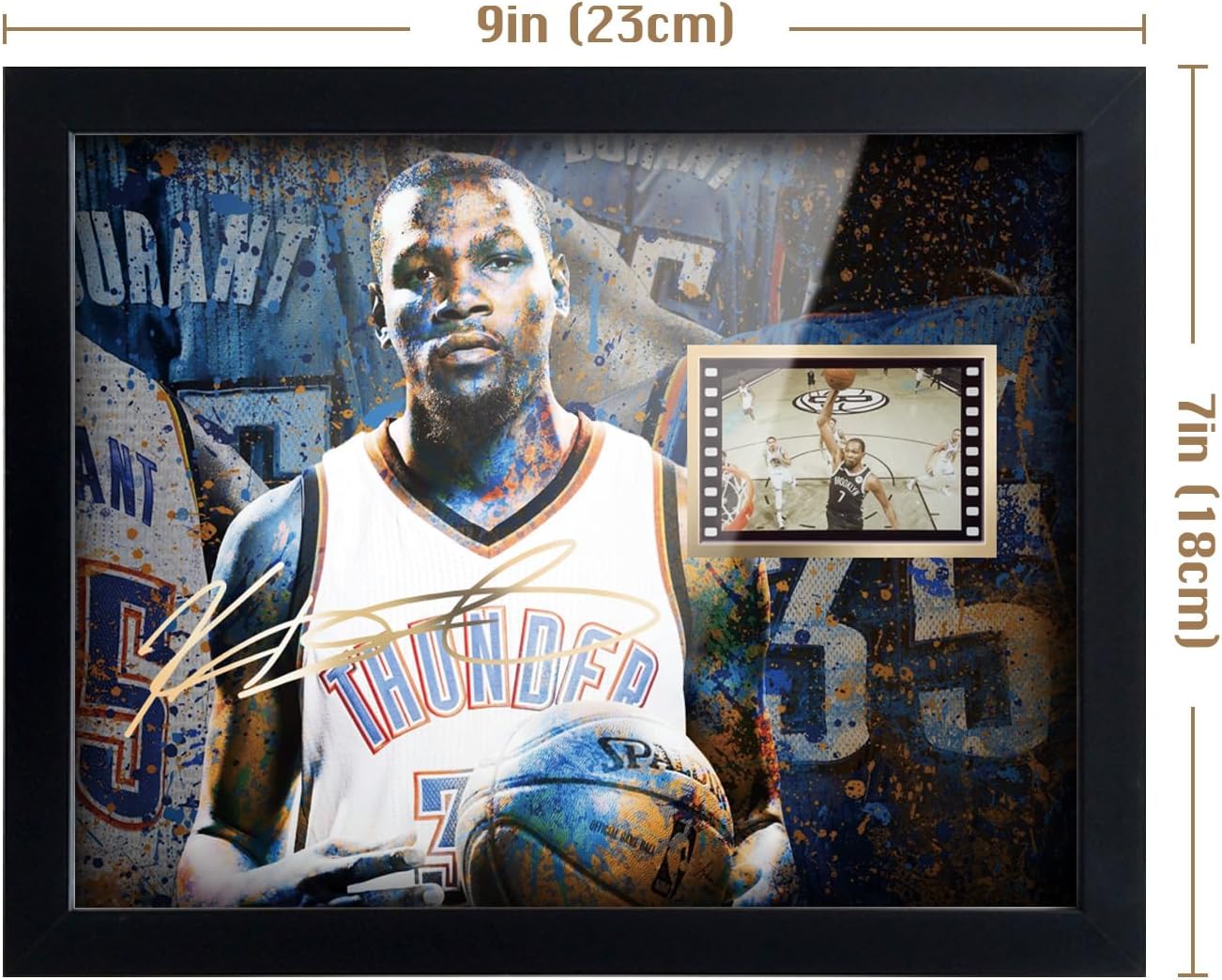 ORIMAMI committed to designing more high-quality collectible gifts and home office decor for huge basketball and soccer fans,suitable for any occasion;The receiver will love it The Pichture Signed:Our designs feature a digital reprint of the original autograph;They are printed,not hand signed originals Amazing Film Recored Display: There is 1x 35mm film showing one scenes of Kevin Durant Fans Favourite Kevin Durant Poster: This is a framed poster that huge basketball fans will love;Club:Golden State Warriors,Brooklyn Nets,Phoenix Suns;Durant won back-to-back championships in 2017 and 2018. He was awarded the NBA Finals MVP award both years.This black frame made of high-quality MDF wood,high transparent PMMA panel;HD printed picture more clear;Picture size:8×6 inches,Framed size:9x7x0.5 inches(23x18x1.2 cm).Framed type is desktop support A great memorabilia gift and a perfect addition to your home decor