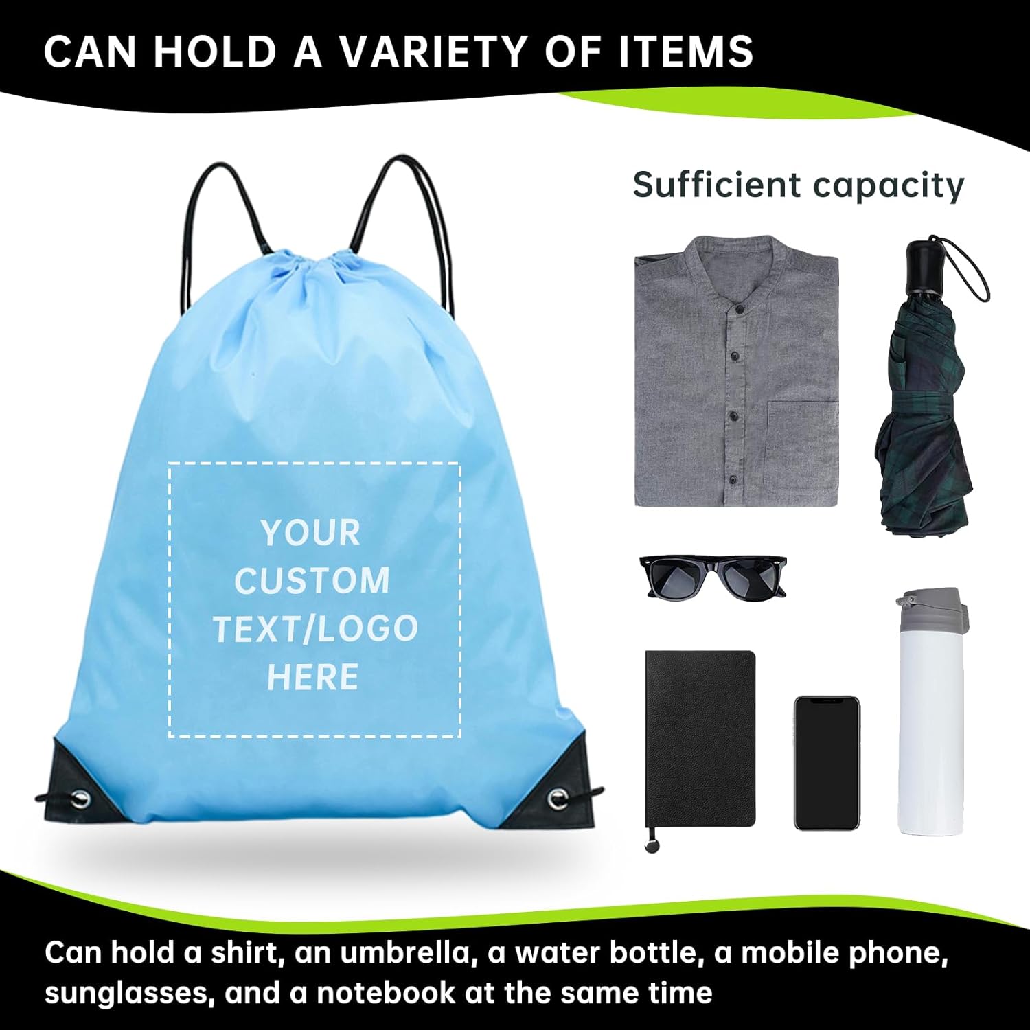 Effective Advertising Tool: These Custom Drawstring Backpacks serve as a great advertisement for your brand. By showcasing your logo on this popular and practical item, you can increase brand visibility and create a positive impression among potential customers
