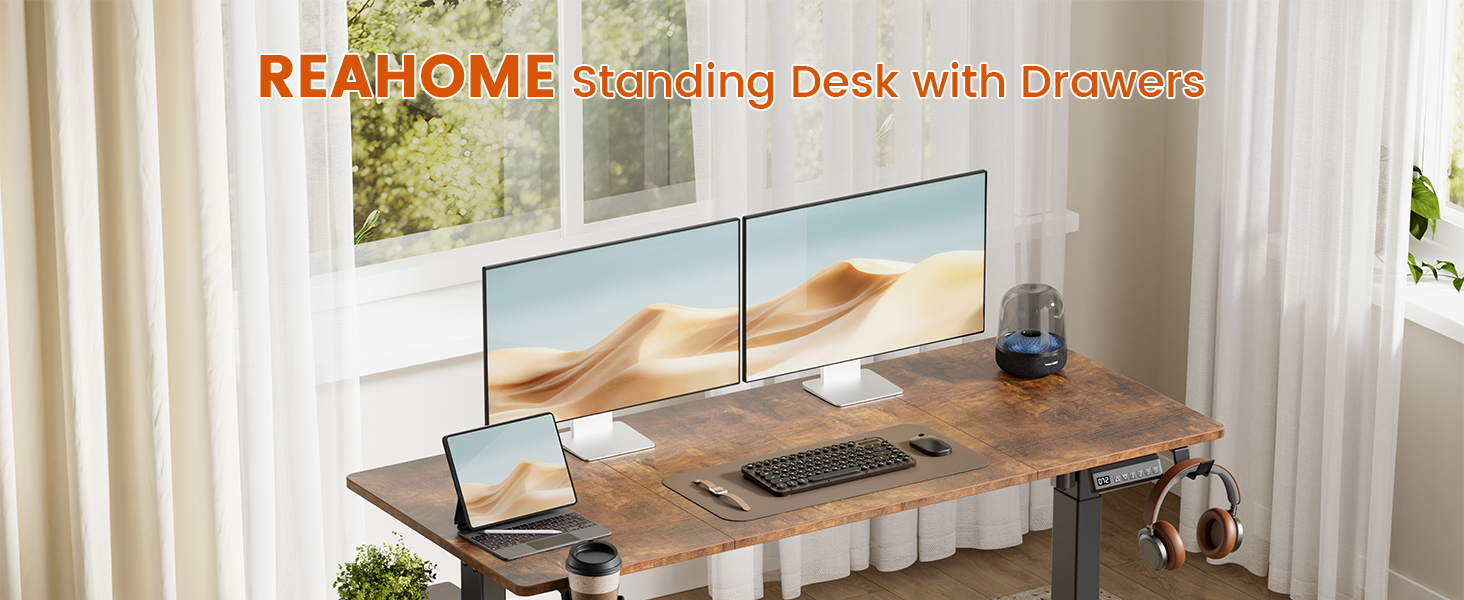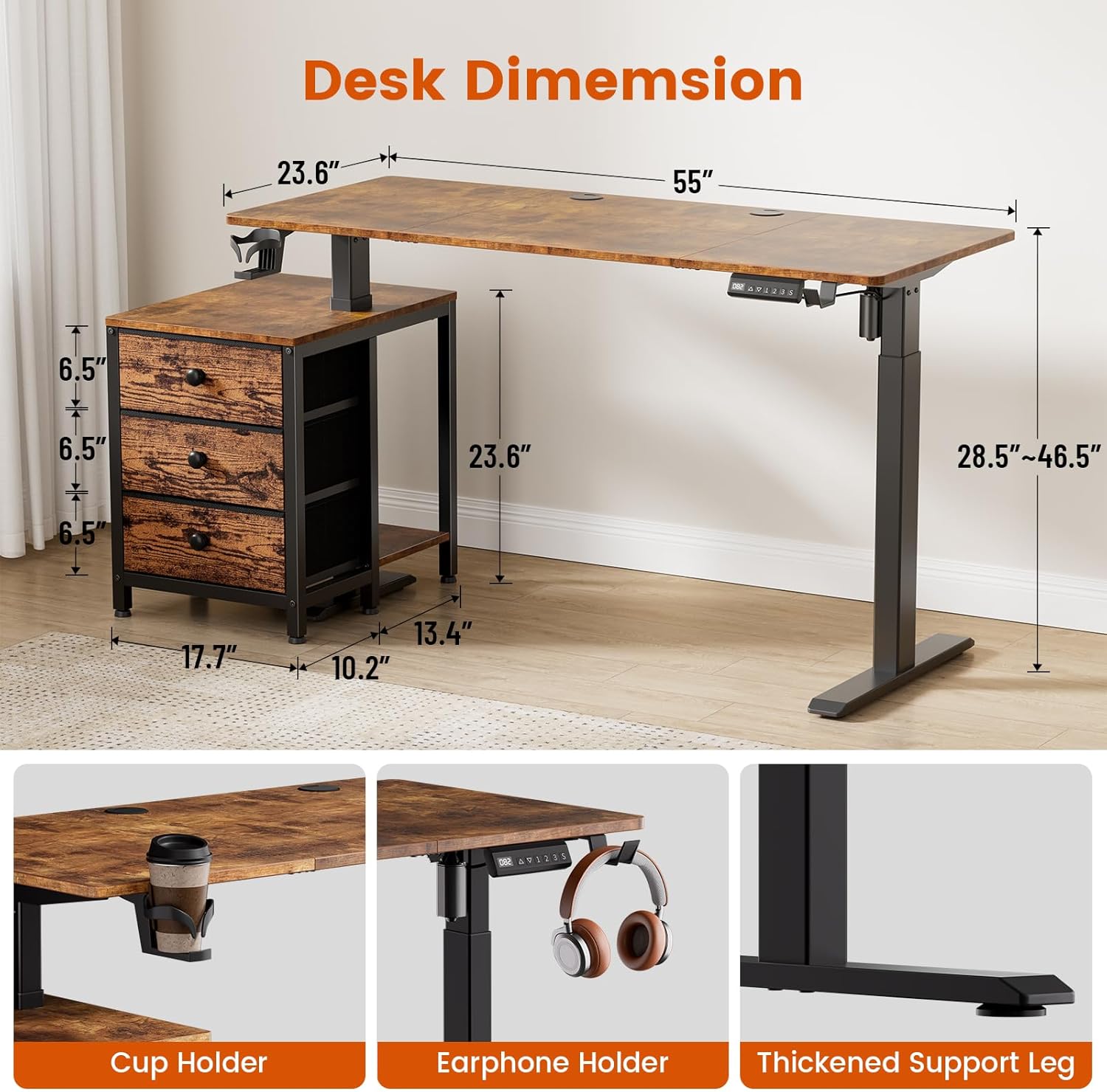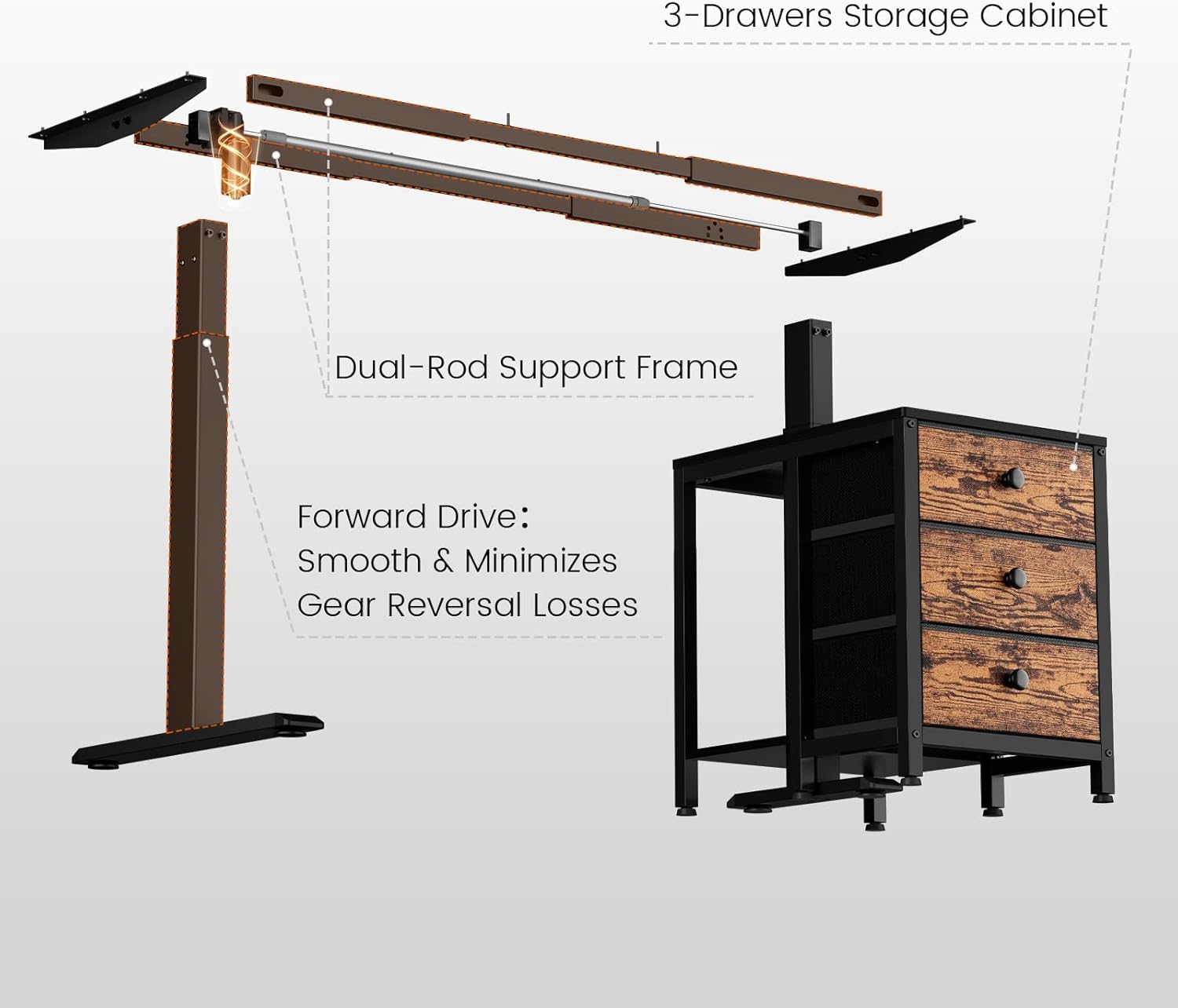 Efficient Desktop Organization: The electric standing desk maximizes organization with File Cabinet to store items out of sight, to keep office supplies, documents, and personal items neatly organized, maintaining a clean workspace.