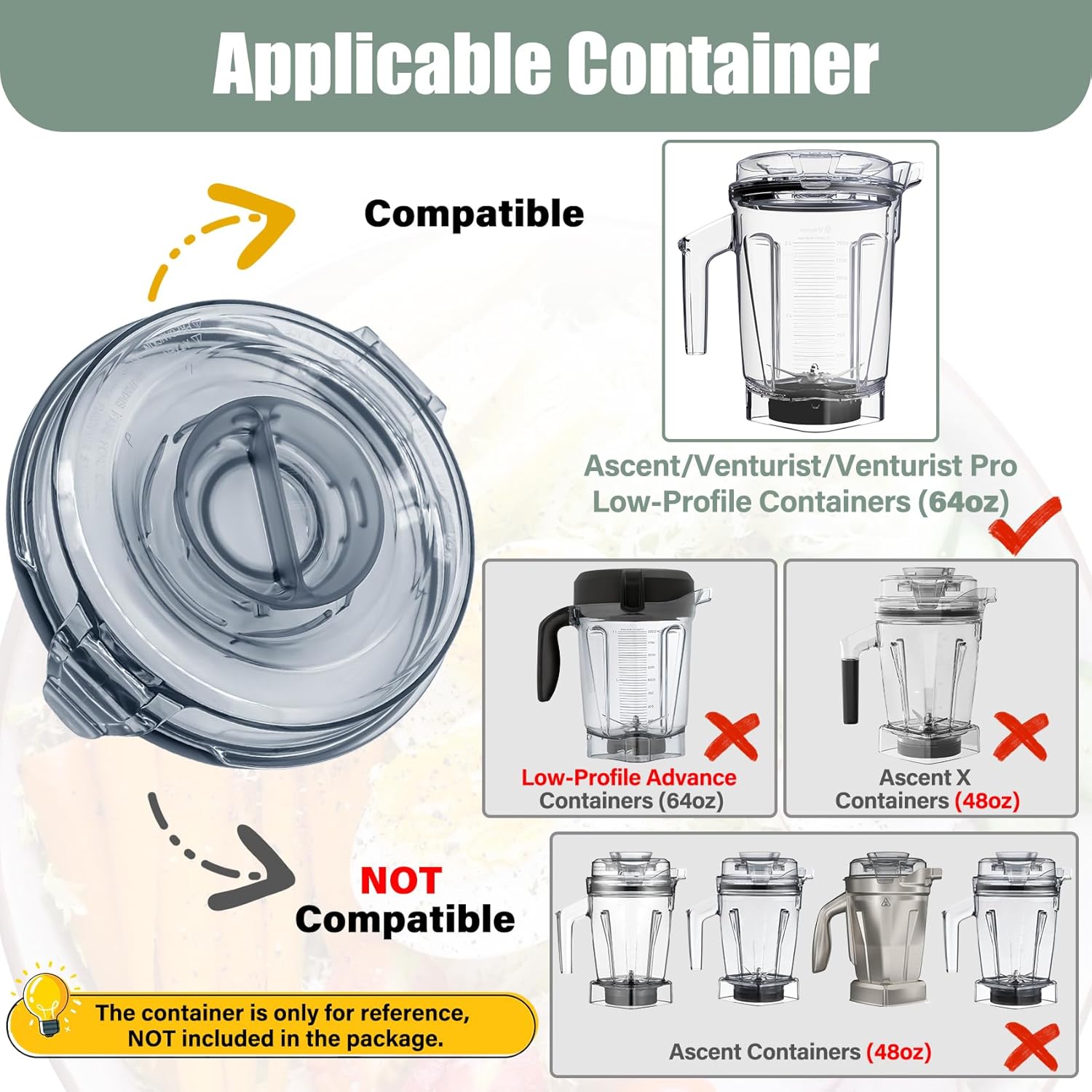 【COMPATIBILITY】- This replacement lid is ONLY compatible with Vitamix Ascent, Venturist & Venturist Pro blender 64 oz Low Profile containers with Self-Detect, including models: Ascent Series (A2300, A2500, A3300, A3500), Venturist Series (V1200, V1500) and Venturist Pro (VM0185B). Please check your blender’s container and model carefully before buying!