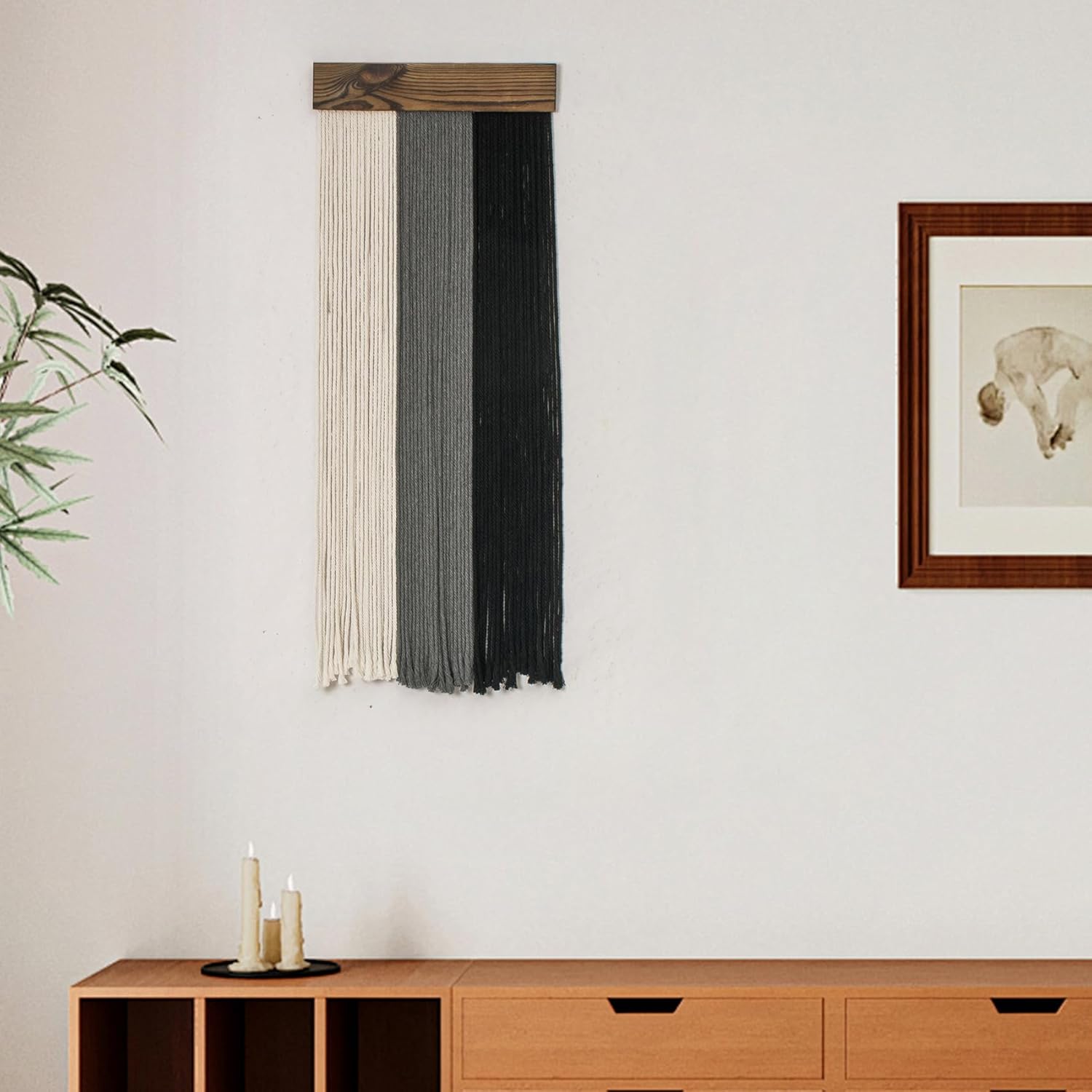 SCECALA Gray Black Macrame Wall Hanging Tapestry, Black Gray White Fibre Handmade Long Macrame Wall Hanging Boho Yarn Tapestry Living Room Bedroom Modern Home Decor, 30.7×11.8 inch