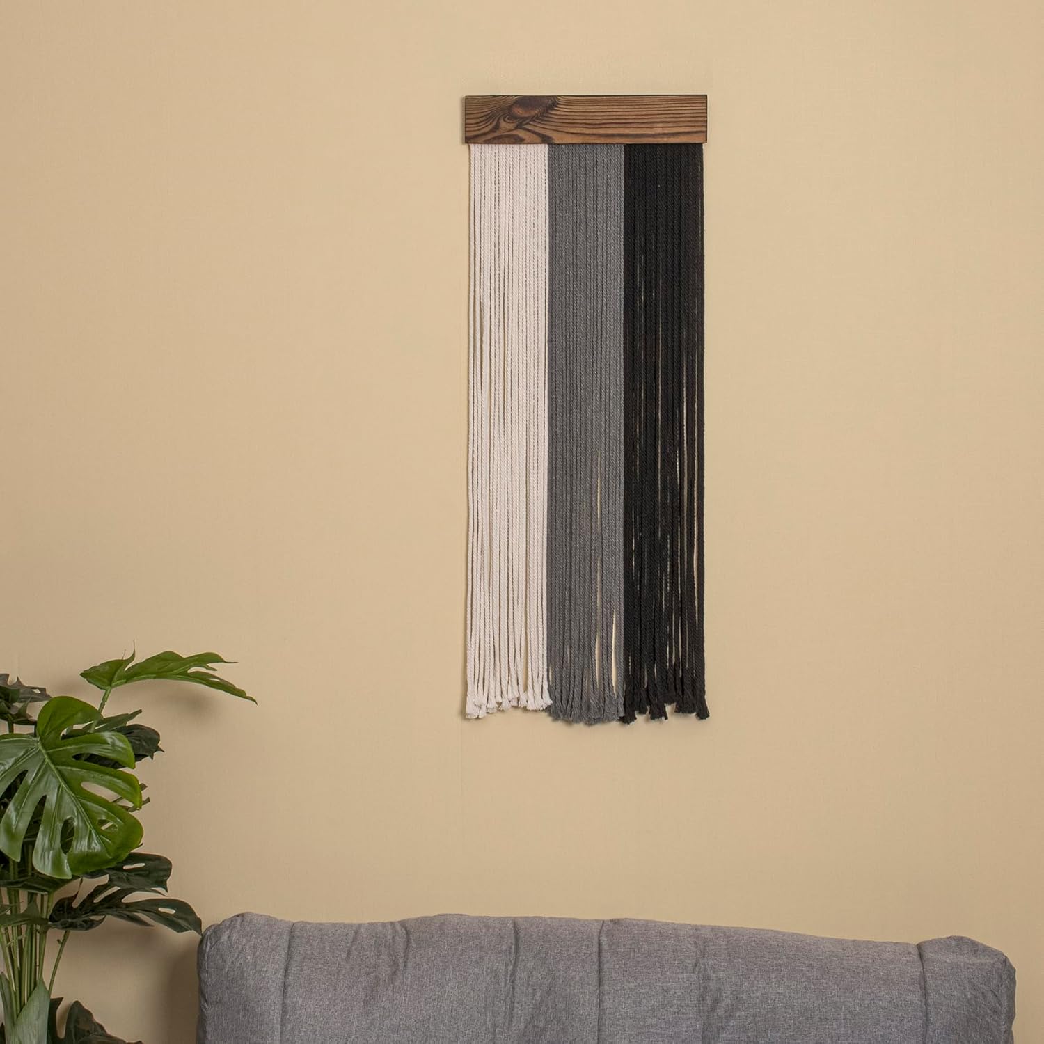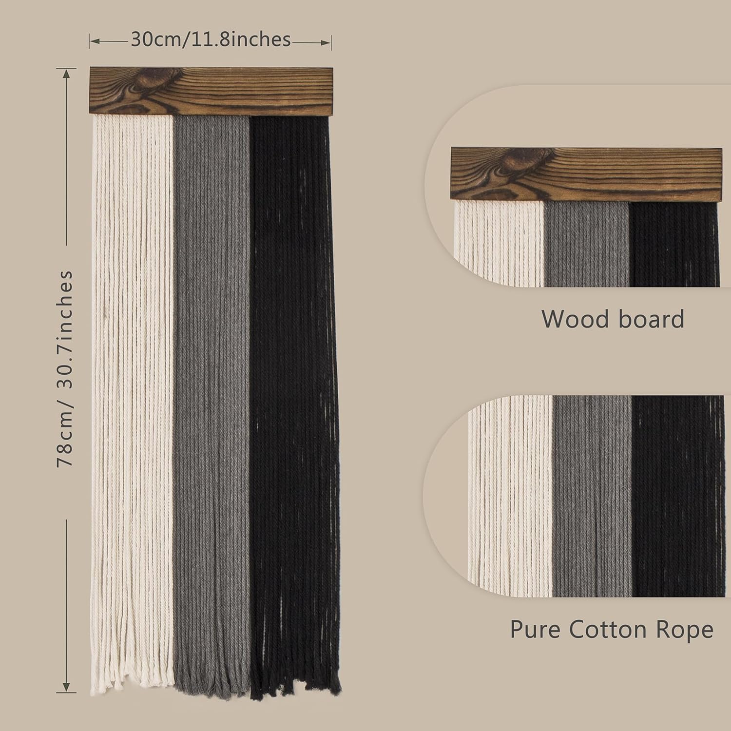 Material: Pure Cotton Cord and Wooden Stick Color: Black Gray White Size: Approx 11.8*30.7inch(30*785cm) Package Included: A Black Macrame Wall Hanging (Wooden Sticks Included)