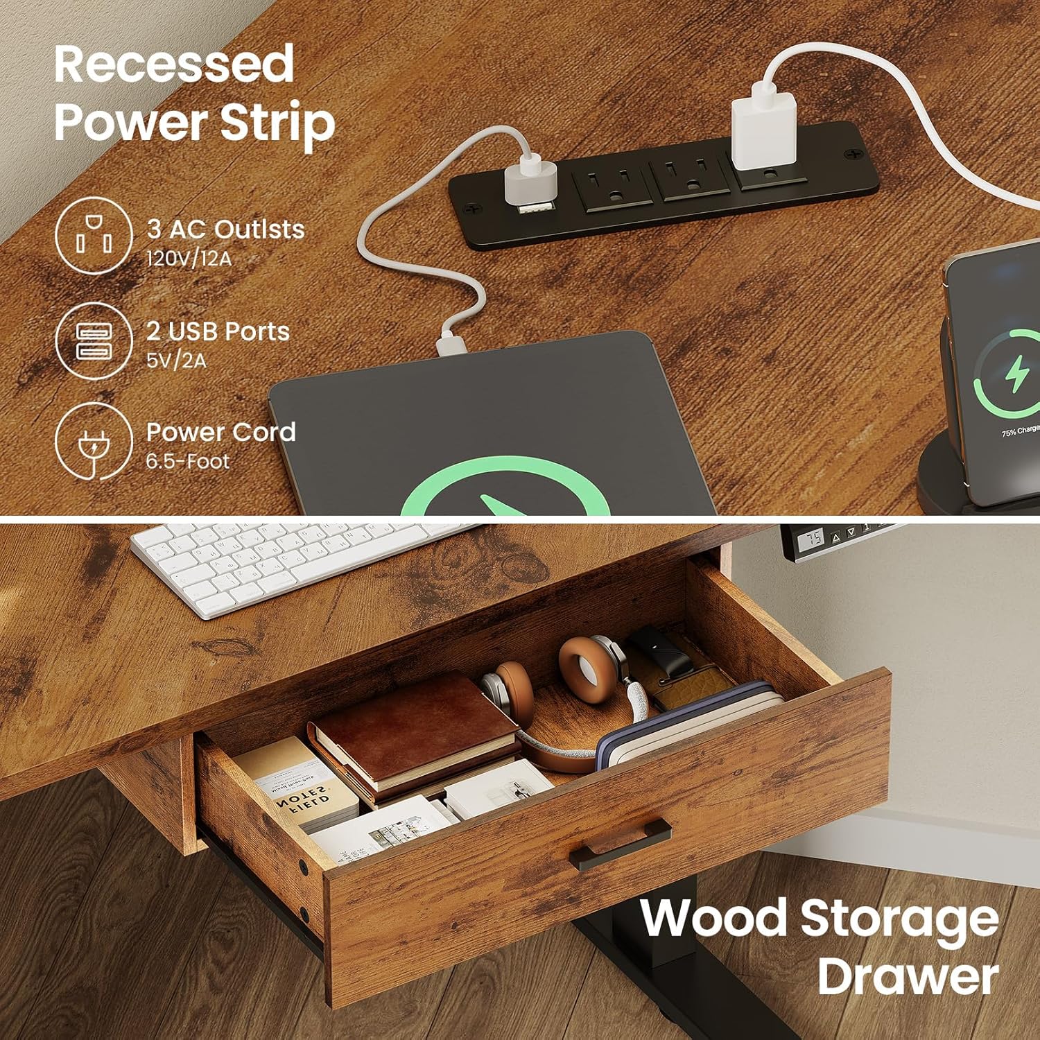 【Space Master, Smart Storage】Don’t let its compact size fool you! This standing desk with drawers cleverly integrates a practical storage drawer and two sturdy hooks underneath, making it easy to stow away items like keyboards, headphones, and cables to maintain a clean desktop. Furthermore, the built-in power strip on the desktop, offering 2 USB ports and 3 electrical outlets, allows you to say goodbye to cable clutter for good and focus entirely on the task at hand.
