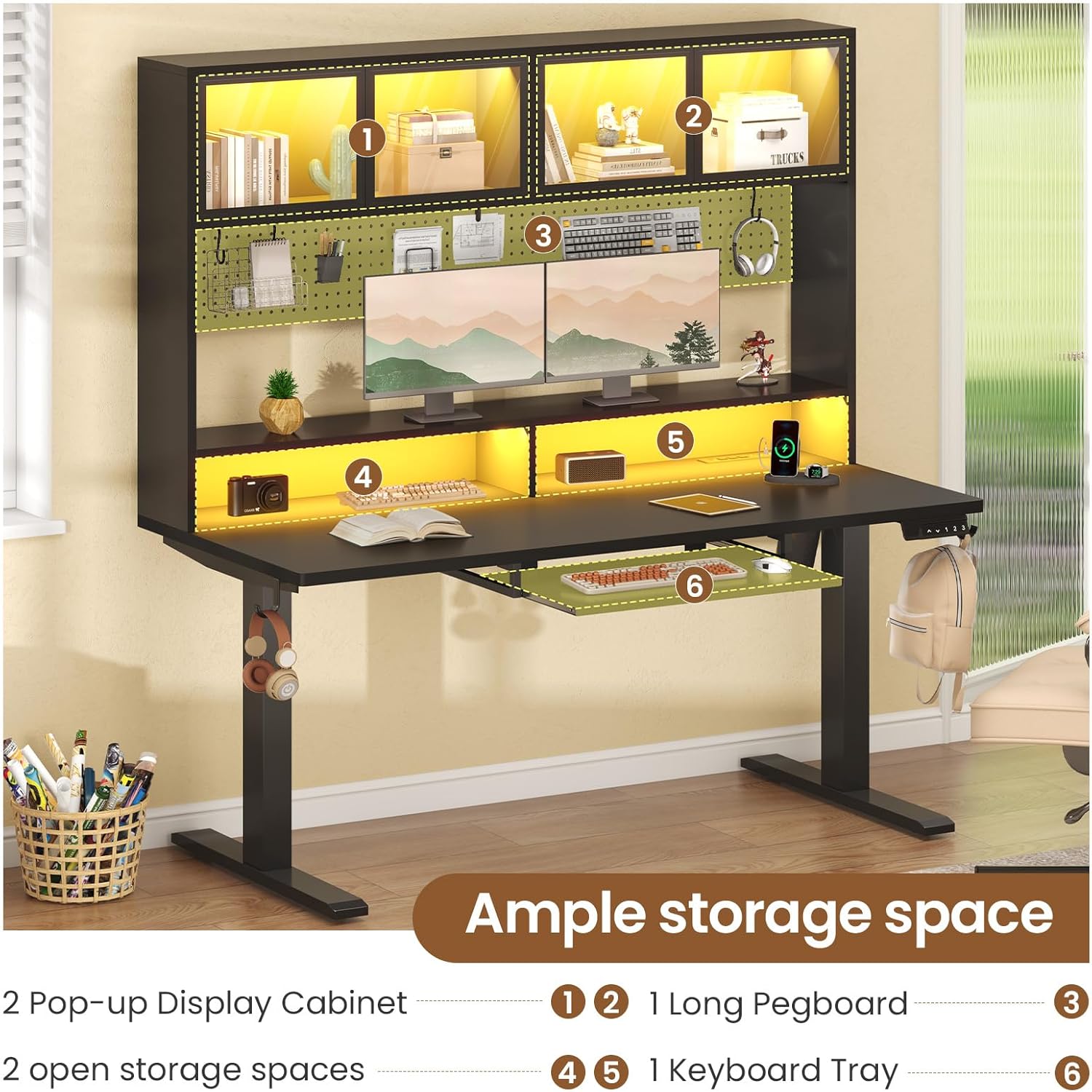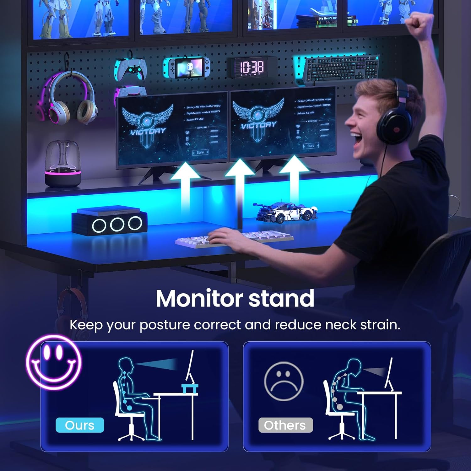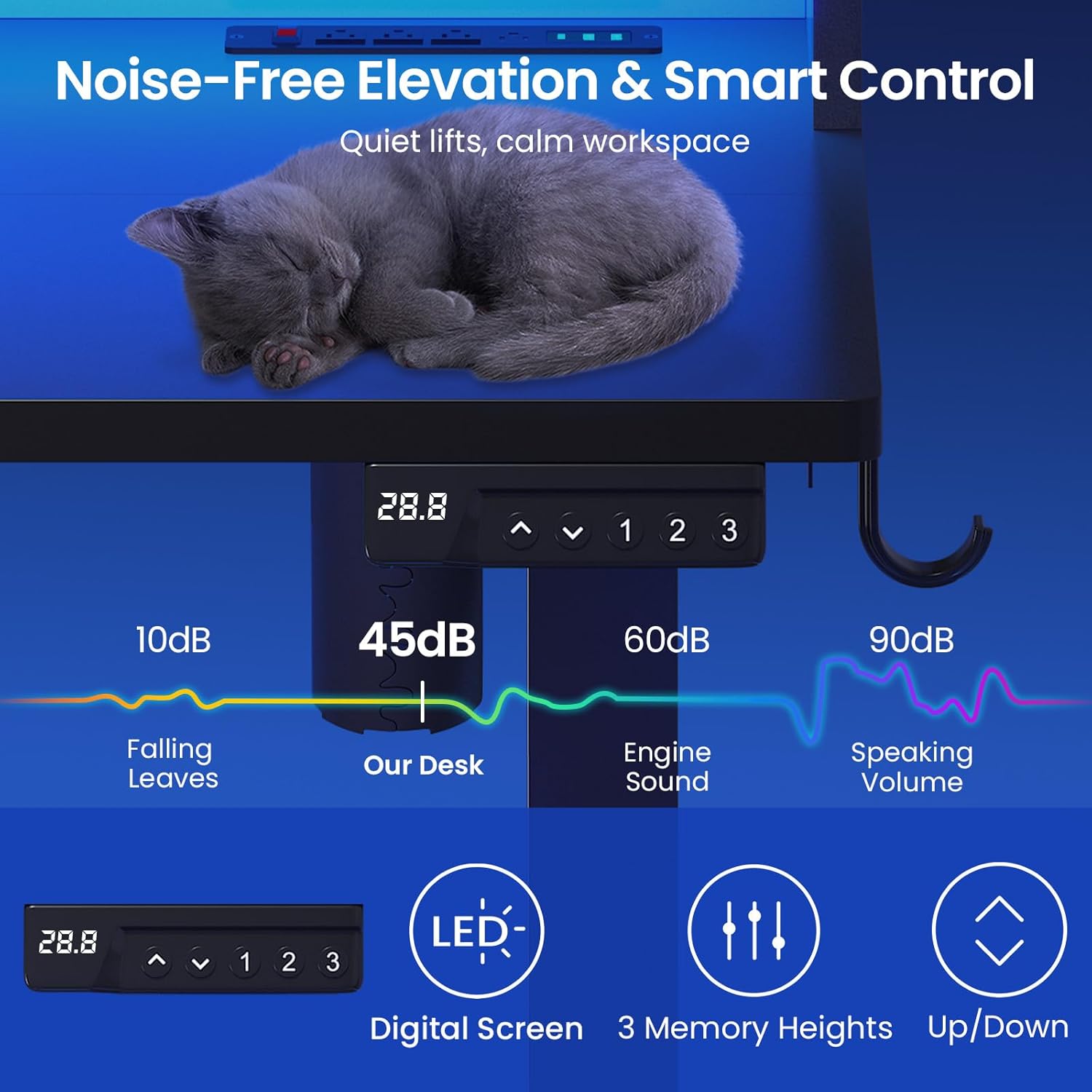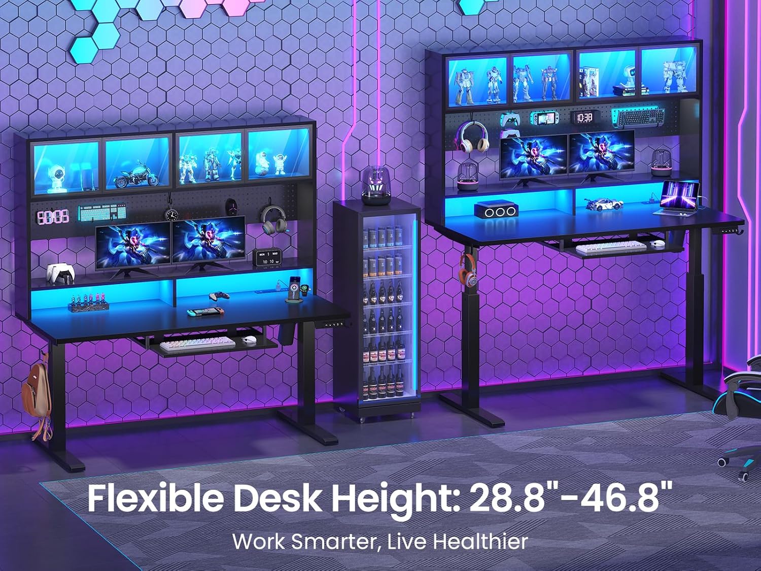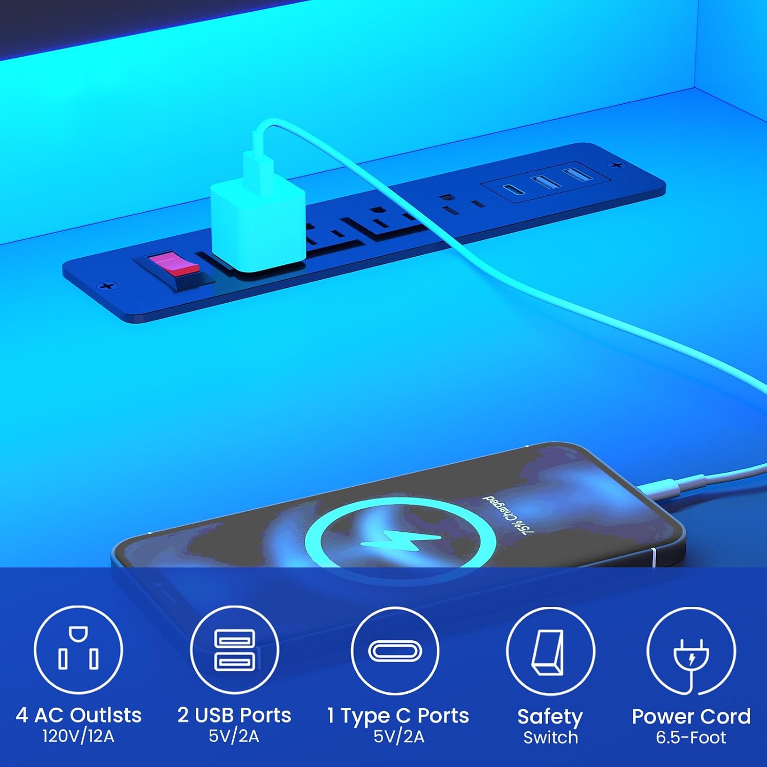 【Charging Port & Smart Led Light】This gaming standing desk includes a built-in power strip with 4 outlets, 2 USB ports, and 1 Type-C port for charging all your gear—phones, tablets、printer or phone—plus a master switch for safe power control. Integrated smart RGB LED lighting offers 60,000+ colors and 29 dynamic modes, syncs to music via an adjustable mic, and is controllable via remote or app for immersive gameplay or vibrant home office energy.
