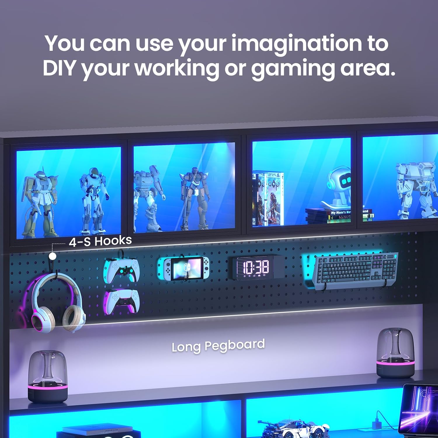 【Display Cabinet & Pegboard】Gaming desk comes with Display Cabinet and pegboard , provides ample space to display your decorations, photo albums, toys, and so on. The doors protect your items from dirt and ash and you can clearly see your decorations. Pegboard wall organizers make full use of wall space for the display and storage of small items. You can use your imagination to DIY your working or gaming area.