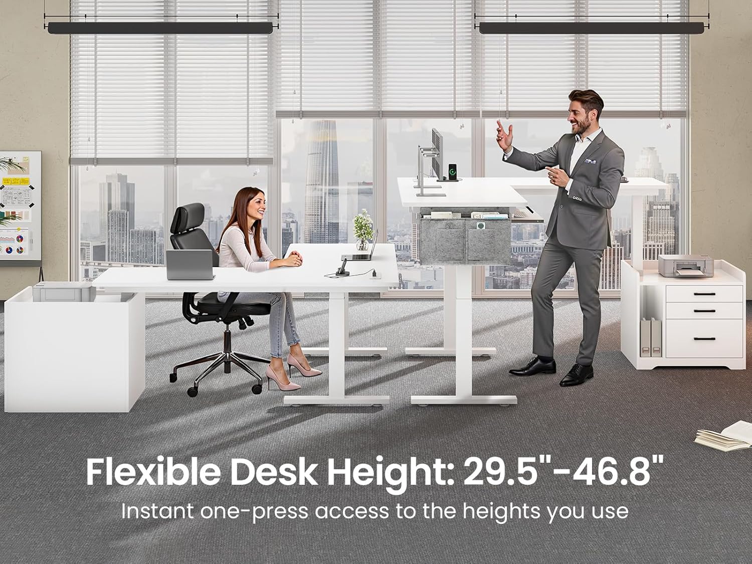 【Multifunctional Workstation】Create a multifunctional workstation with this l shaped standing desk, equipped with filing cabinets, 3 storage drawer, power outlets, storage bag, keyboard tray and a lifting motor to meet all your needs. The L-shaped design maximizes corner space and expands storage capacity.