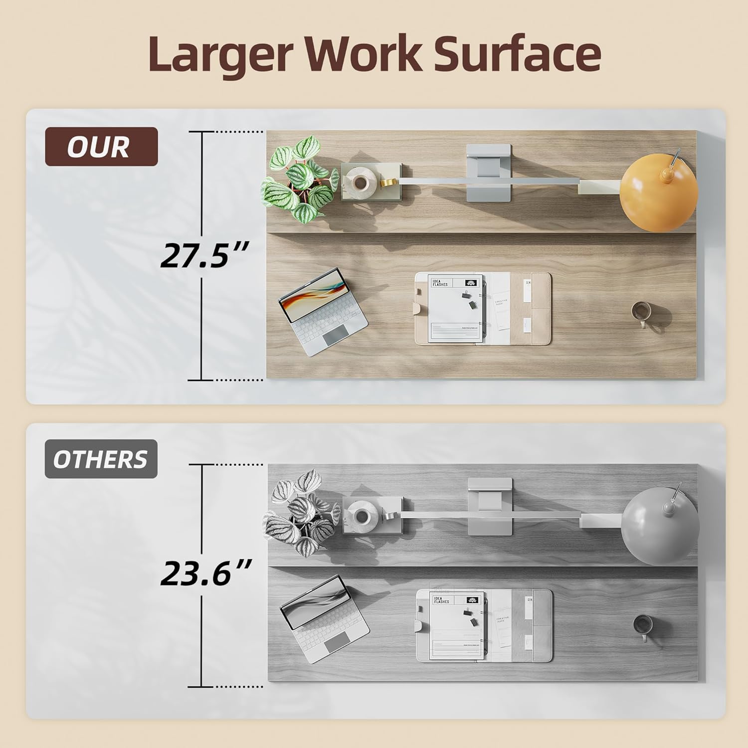 Wider Desktop Design: Compared to standard standing desks, the extended desktop offers a more spacious and comfortable work environment.