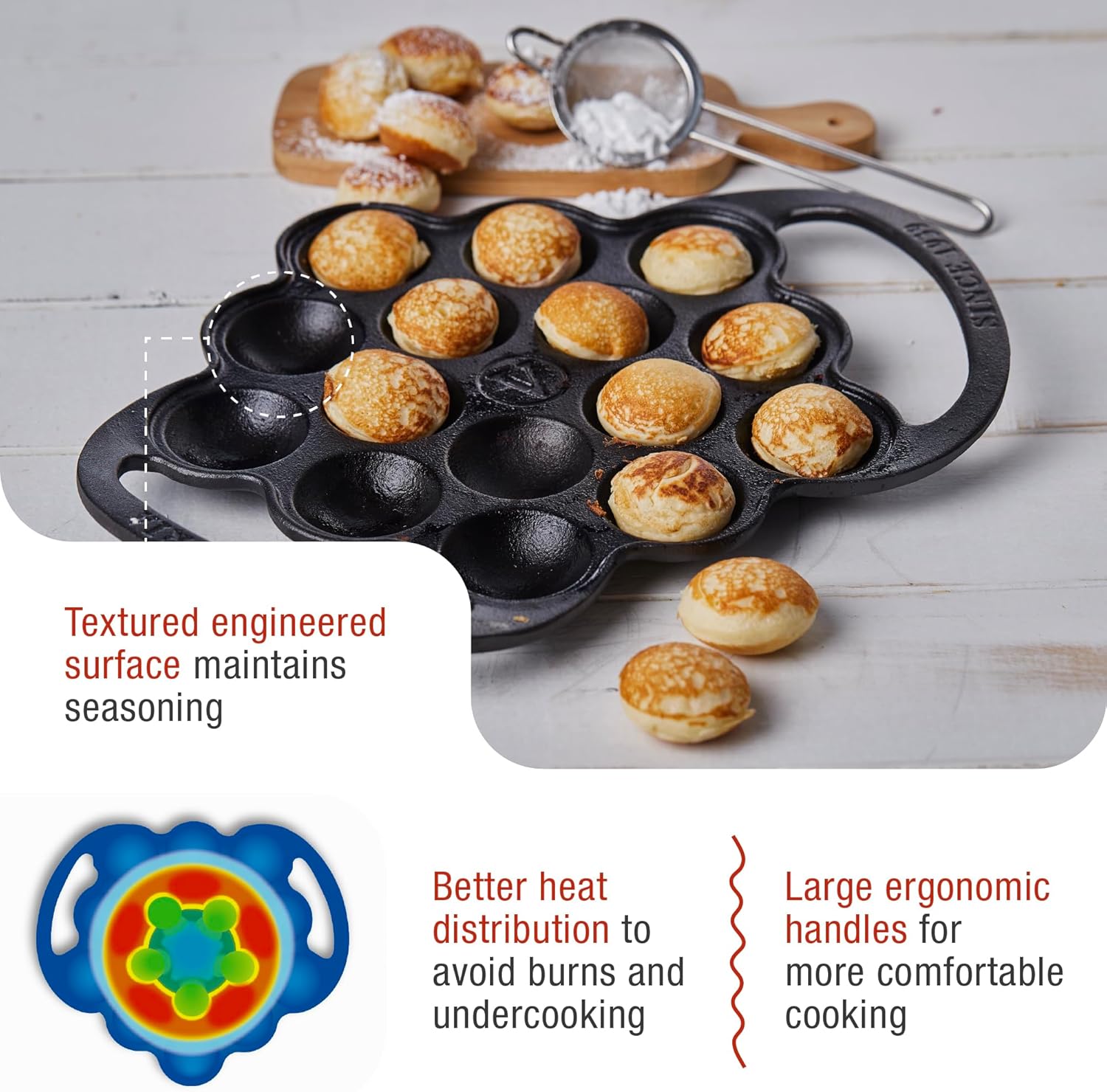 EASY TO USE: Give your cooking an upgrade by using cast-iron cookware. Durable and rugged, this cast-iron poffertjes maker is easy to use to make Dutch mini pancakes, muffins, eggs, and dessert dishes like kanom krok, aebleskiver, poffertjes, and more! It will last through years of great meals.