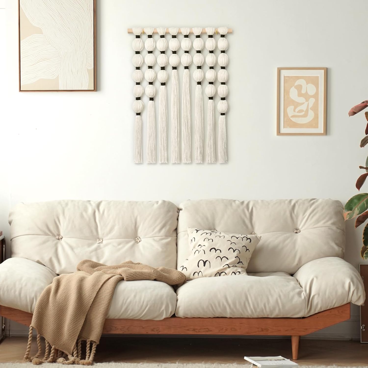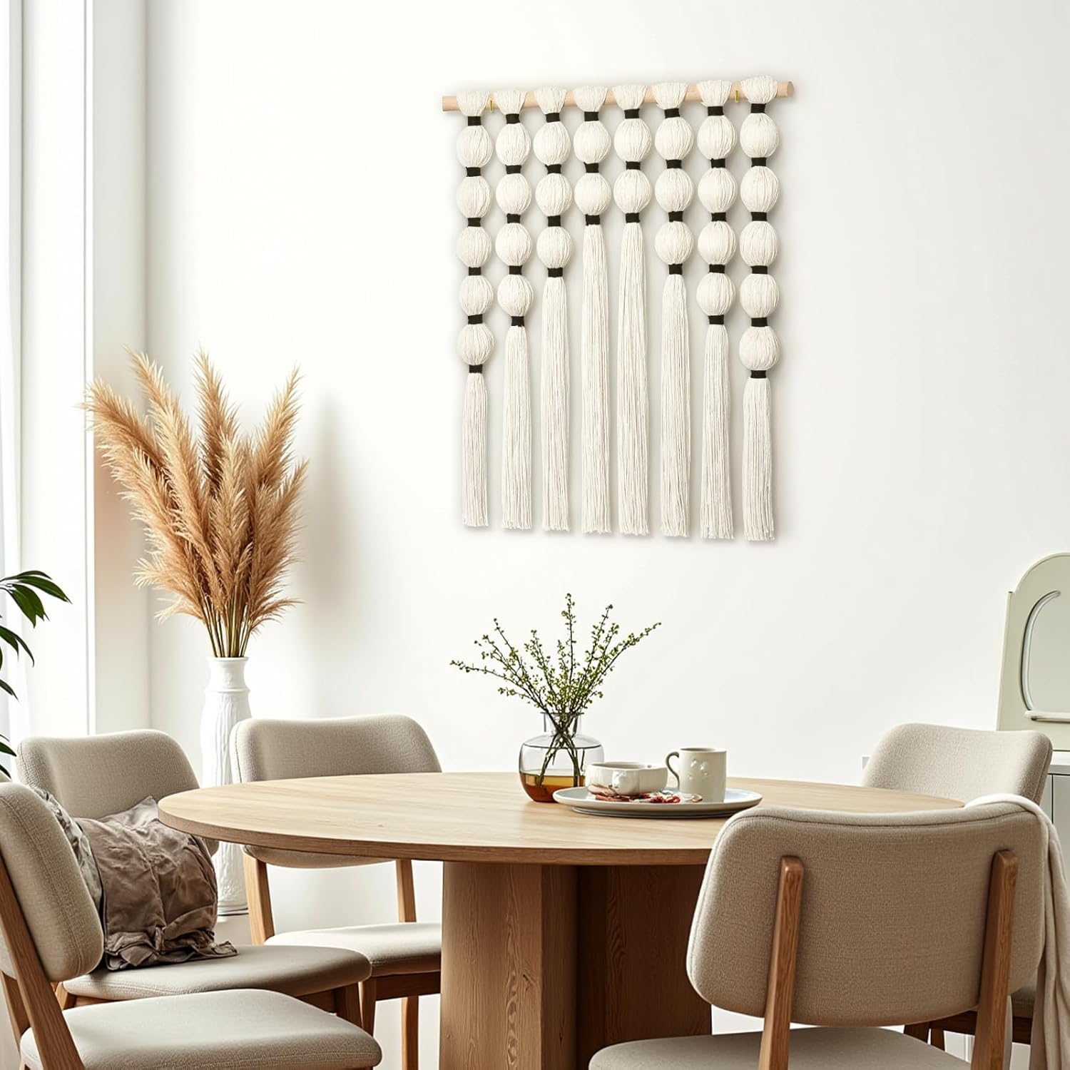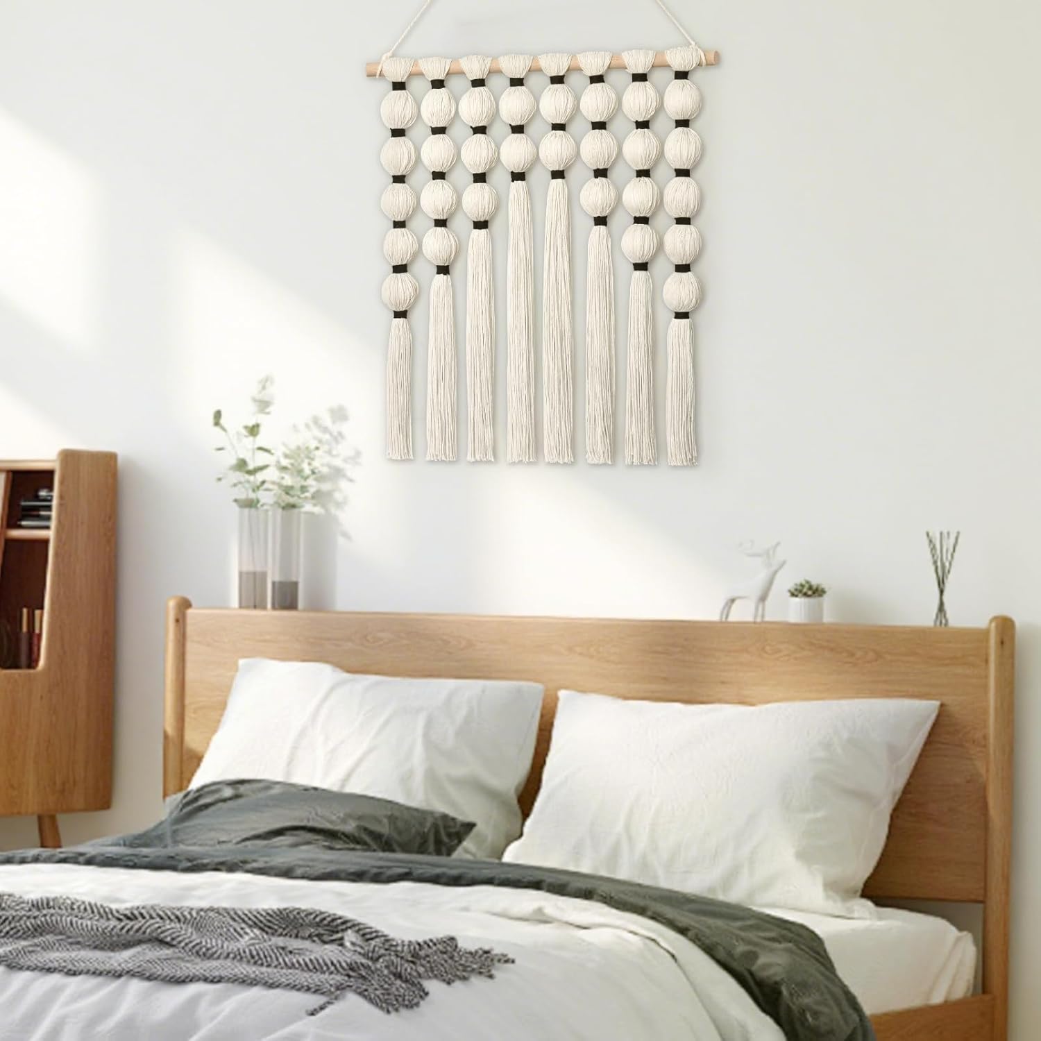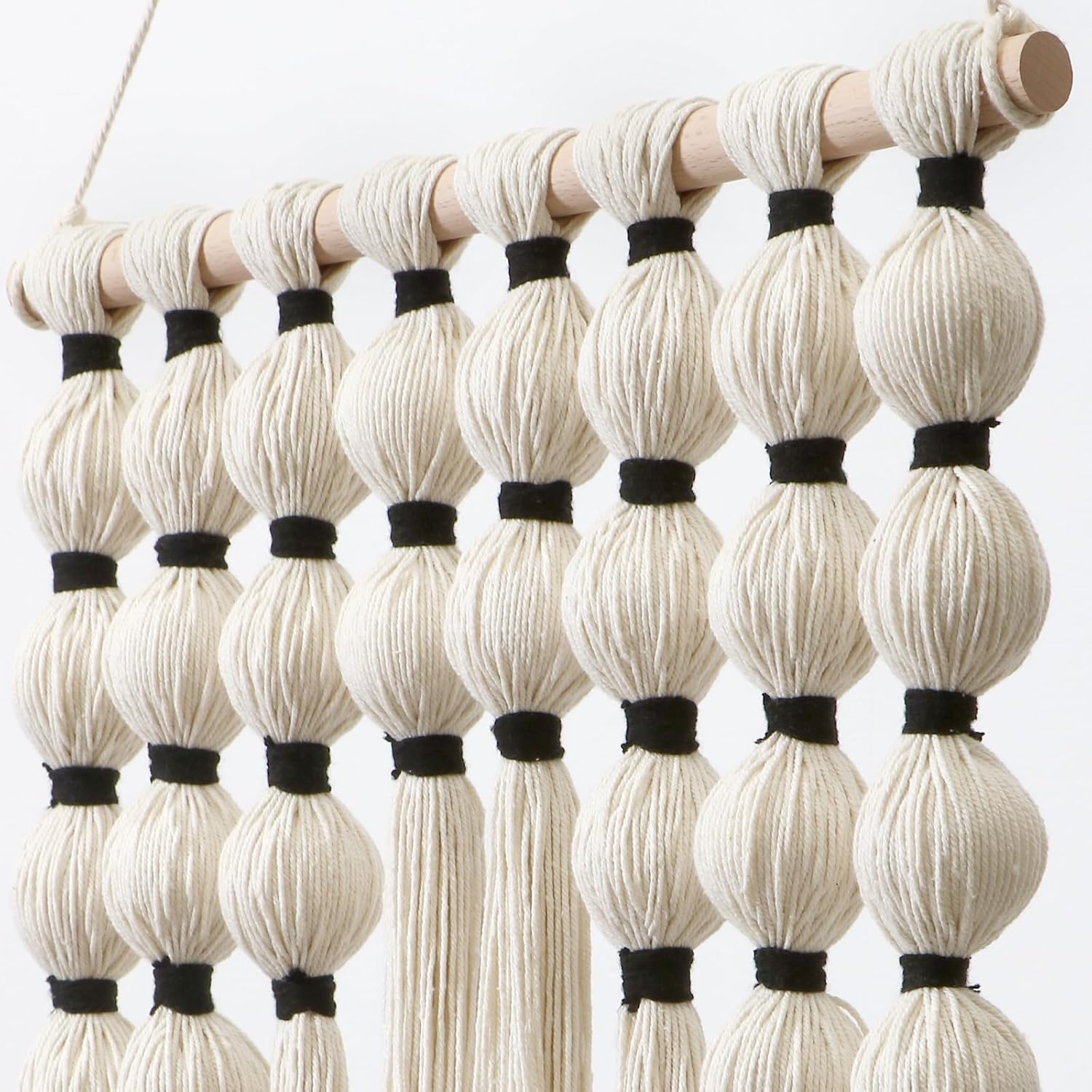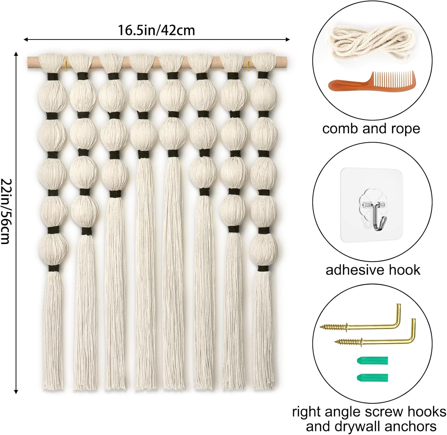 【Macrame Wall Hanging】This modern aesthetic wall hanging measures 16.5 inch x 22 inch (42cm x 56cm), and this size fits for hanging on walls. The macrame wall hanging decor is crafted from soft off-white cotton cords for a cozy feel and paired with a sturdy wooden rod. Small balls are neatly bound within its fiber threads.