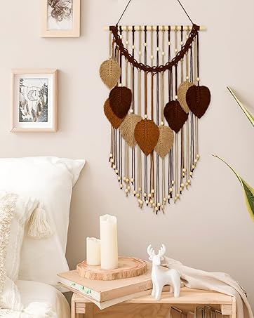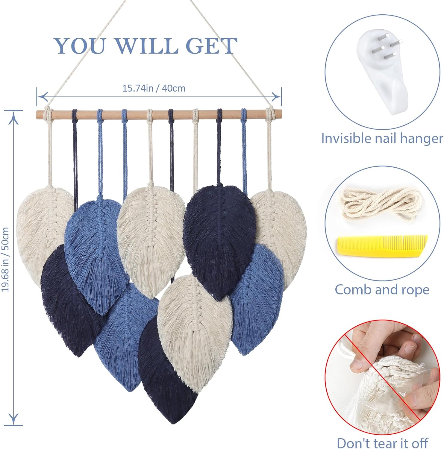 【Macrame Room Ornaments】There is a clear protective film on the back of leaf to maintain its shape. DO NOT remove back film. If macrame feather was messed up in transit, please use a comb to brush threads to keep its shape. Warm Note: Our leaves macrame wall hanging is a finished product, not a DIY product.