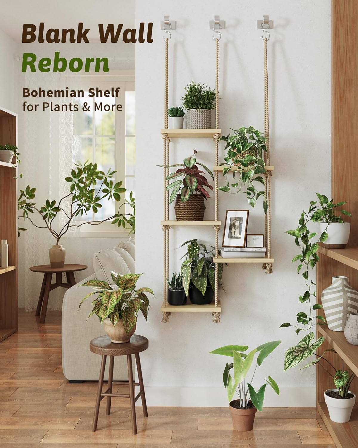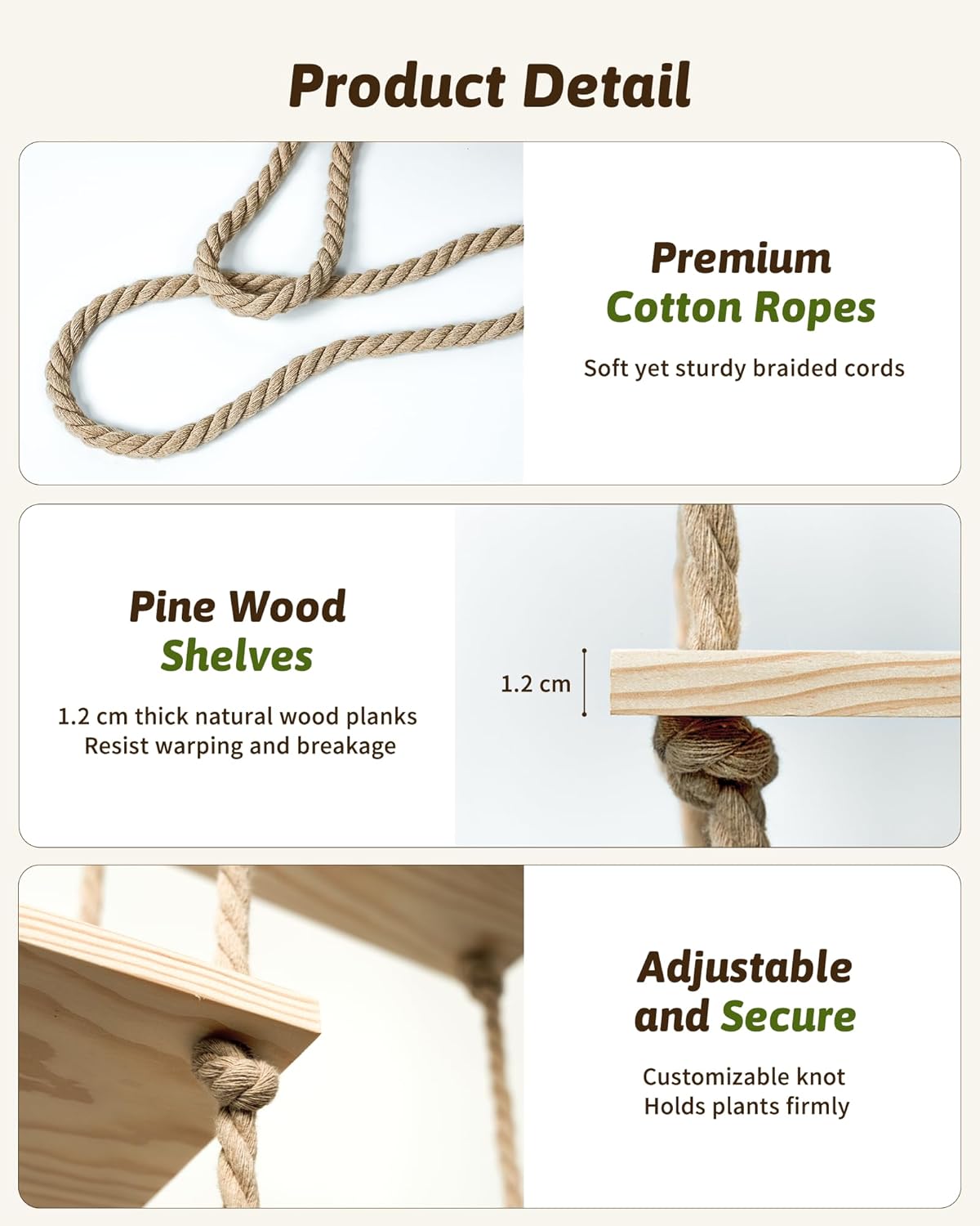 Authentic Boho Charm: Handcrafted from natural pine wood and soft cotton ropes, this hanging plant stand brings organic texture to your space. The earthy materials create instant bohemian warmth when paired with greenery.